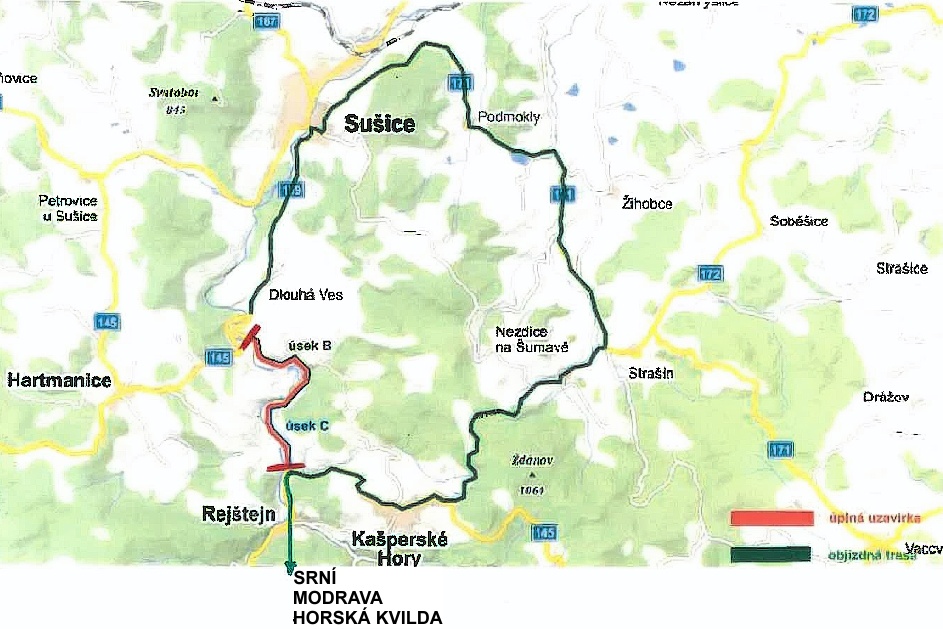 Objízdná trasa pro veškerou dopravu je vedena ze Sušice přes Podmokly, Dražovice, Nezdice do Kašperských Hor, odtud do Rejštejna, odkud pokračuje standardně bez omezení na Srní, Modravu a Horskou Kvildu.