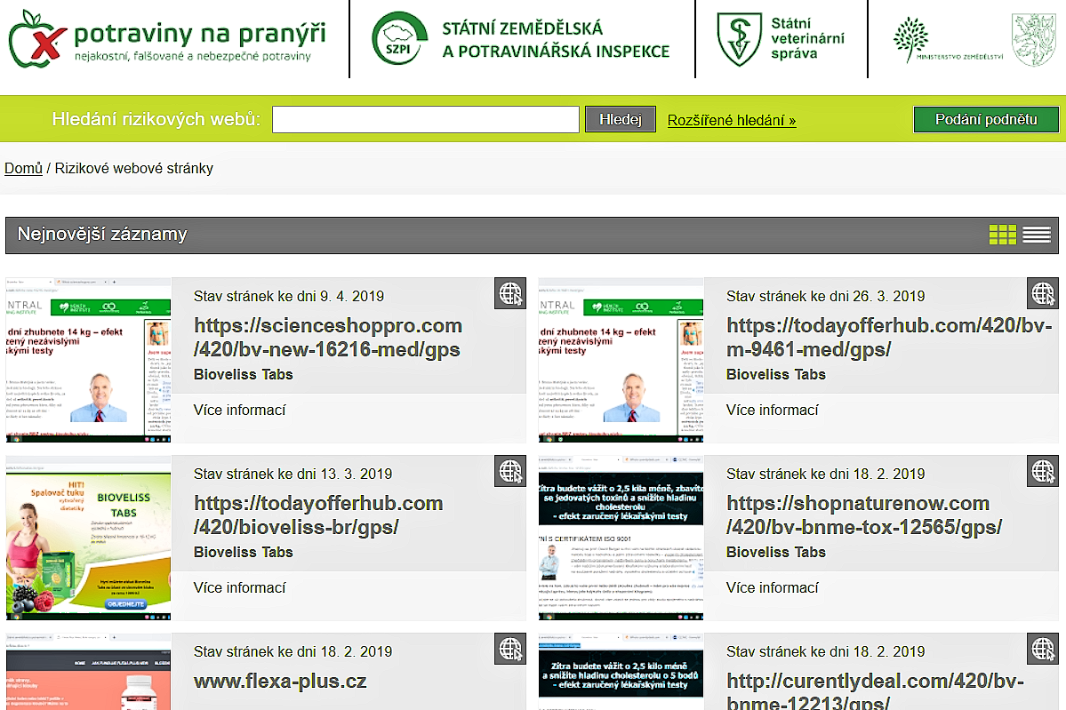 Tato služba informuje spotřebitele o webových stránkách, u kterých SZPI zjistila, že nabízejí potraviny – zejména doplňky stravy – v rozporu s právními předpisy ČR a EU.