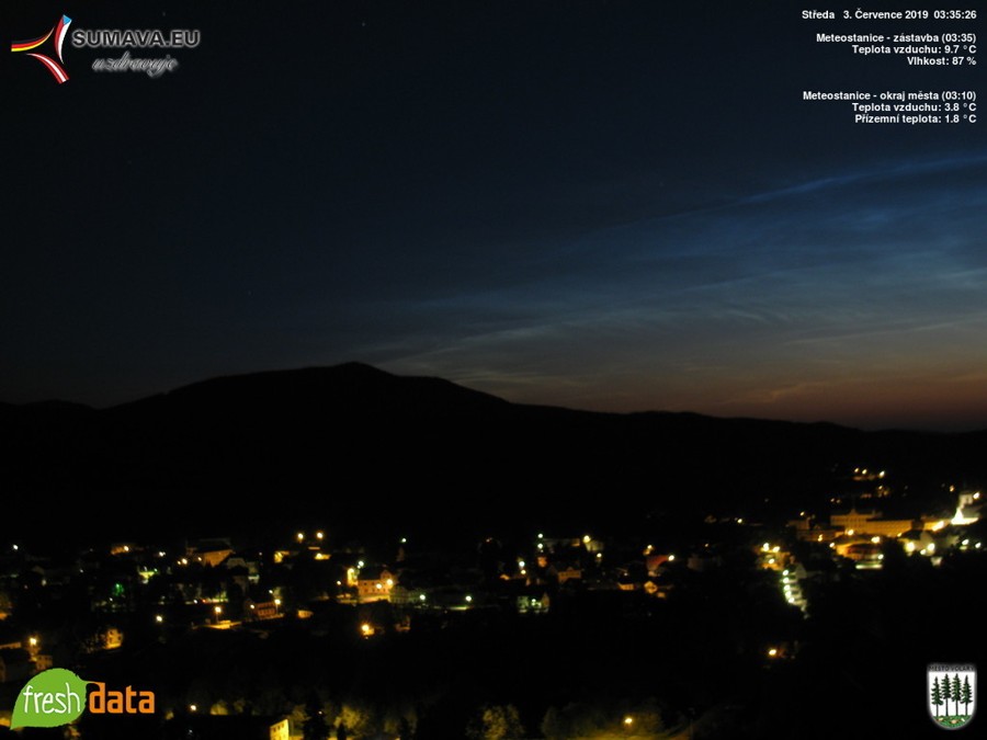 Přestože vhodnější podmínky pro pozorování jsou obecně až nad 50. rovnoběžkou, tedy v severní polovině našeho území, lze někdy s úspěchem noční svítící oblaka sledovat i ze Šumavy. Právě 3. července zde byly v době před svítáním v tomto směru v letošním roce zatím asi nejlepší pozorovací podmínky. Noční svítící oblaka byla také zaznamenána hned několika kamerami SUMAVA.EU.