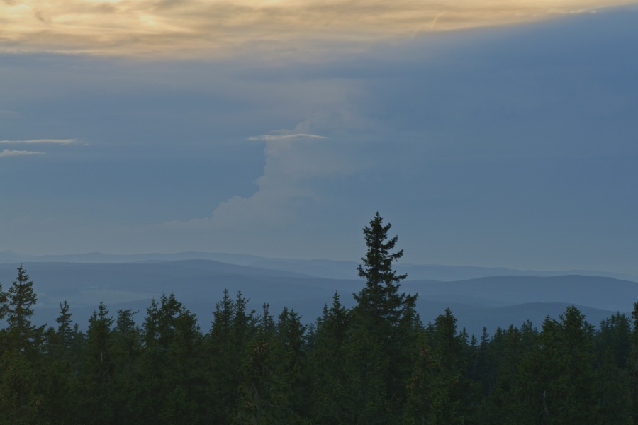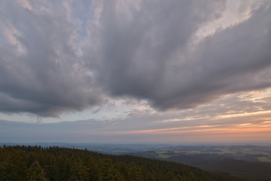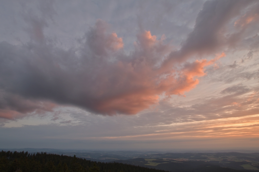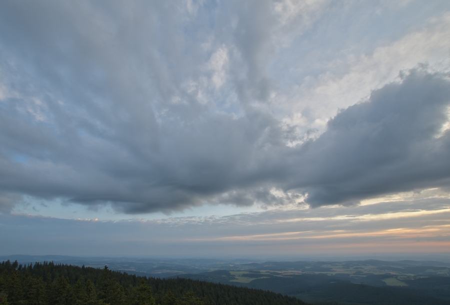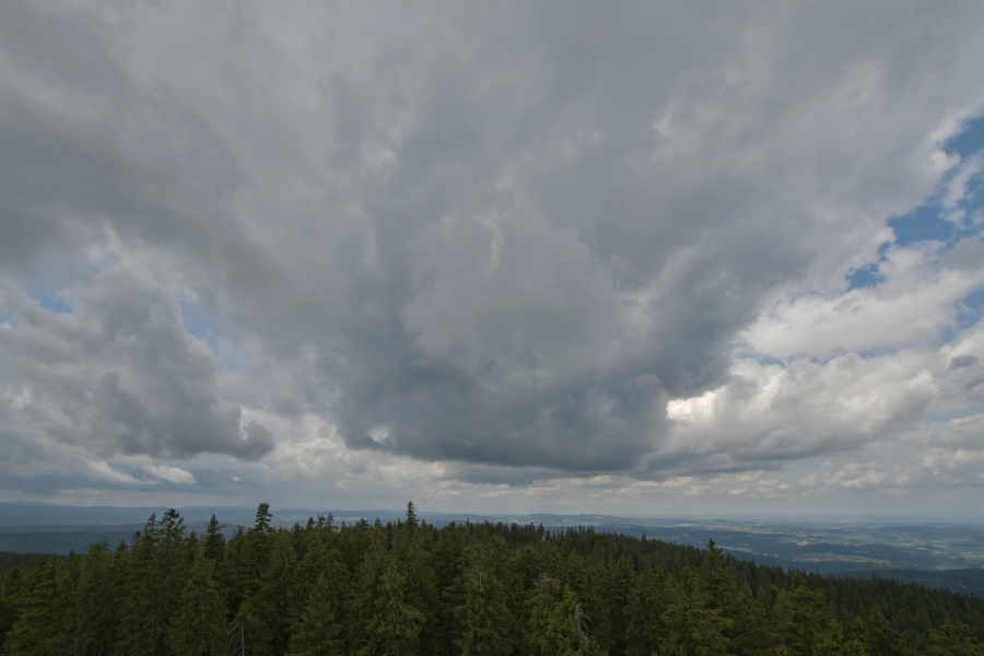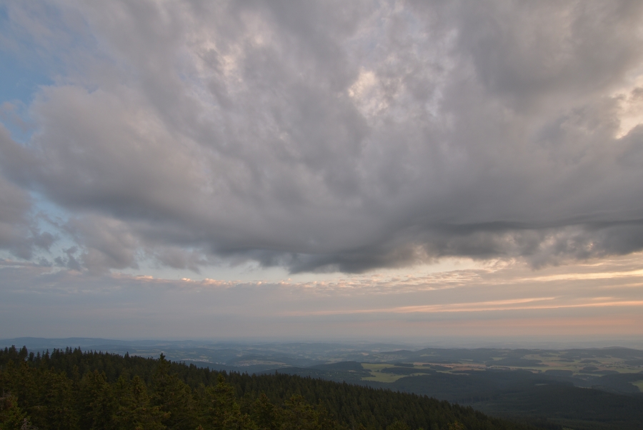 Časně zrána se opět potvrdilo, že nejednou býváme vystaveni klamavým oblačným úkazům. Pohledem z Třístoličníku, resp. Hochsteinu se napravo od Bobíku (připomeňme si, že naše šumavské bratry odtud vidíme v obráceném pořadí nežli třeba z Libína – tedy jako první zleva Boubín a dále vpravo Bobík) zdá rozpínat bouřková kovadlina. Radar nicméně hlásil, že v rámci celé Evropy se nejbližší bouřkové aktivity vyskytují v severní Itálii.
