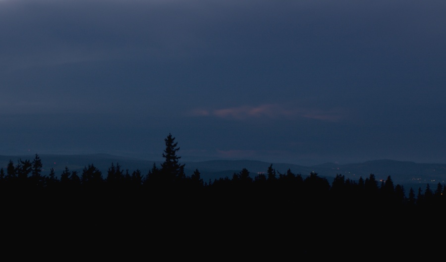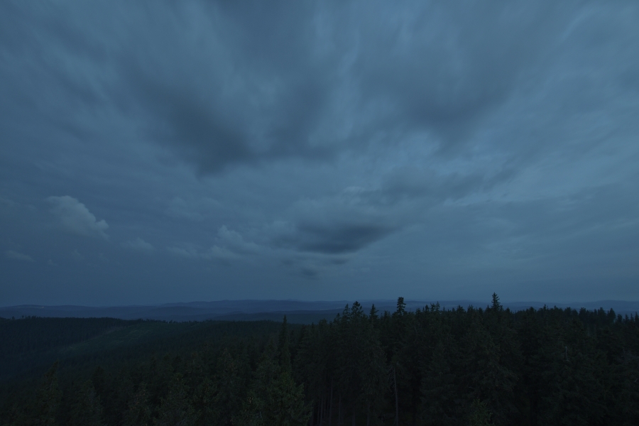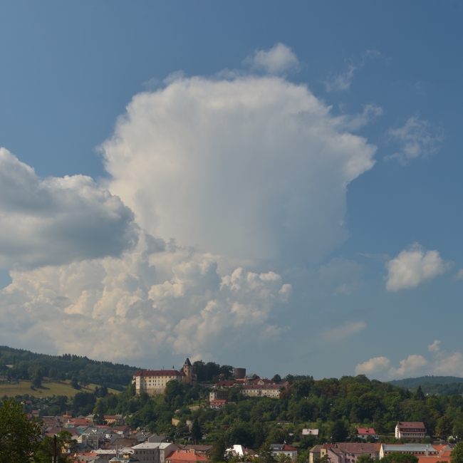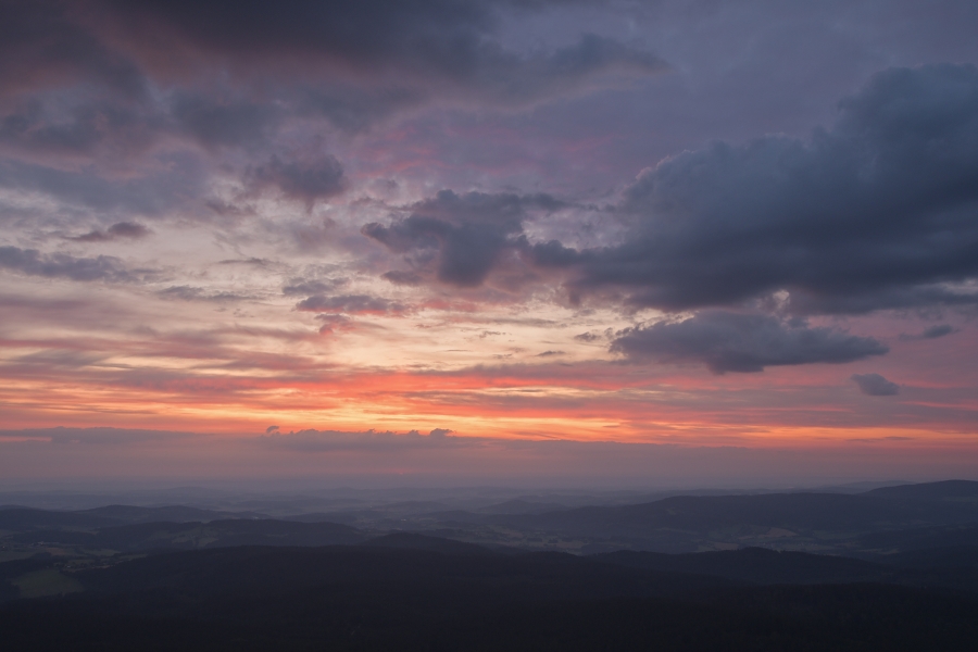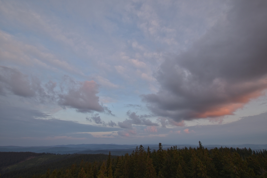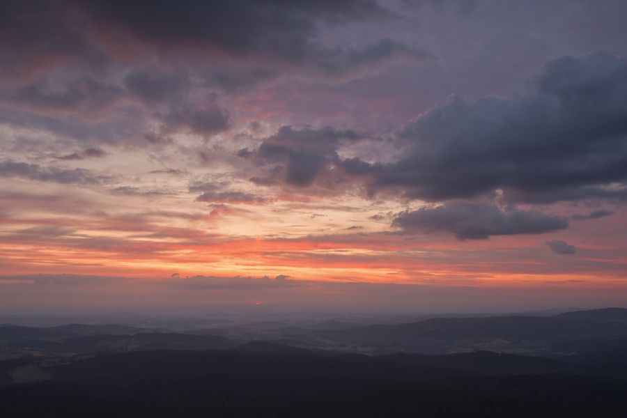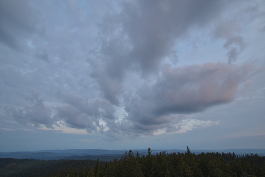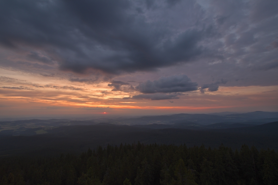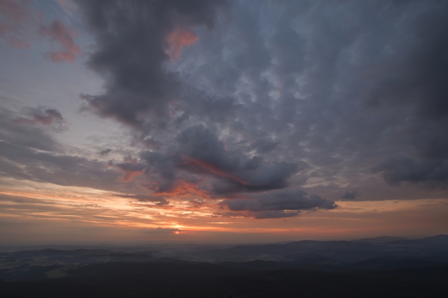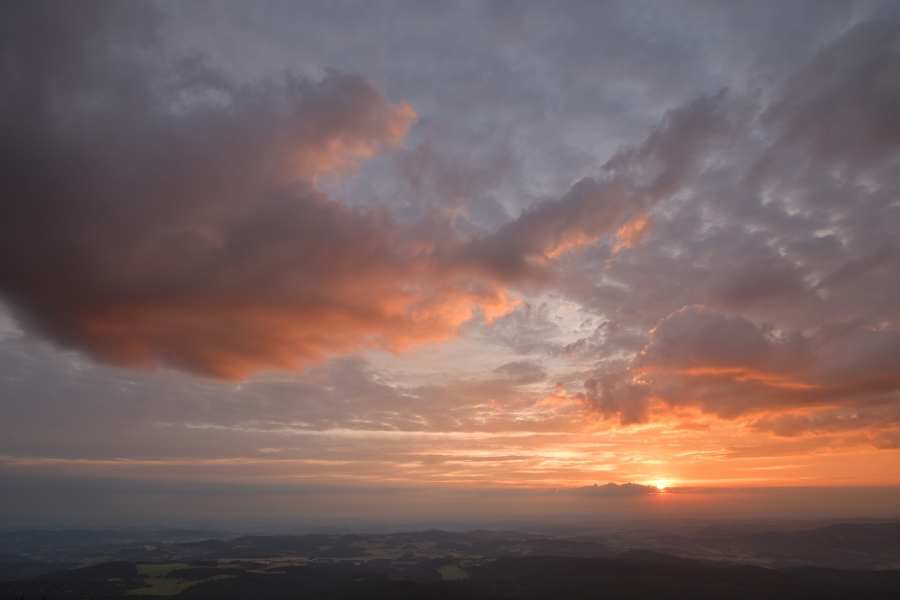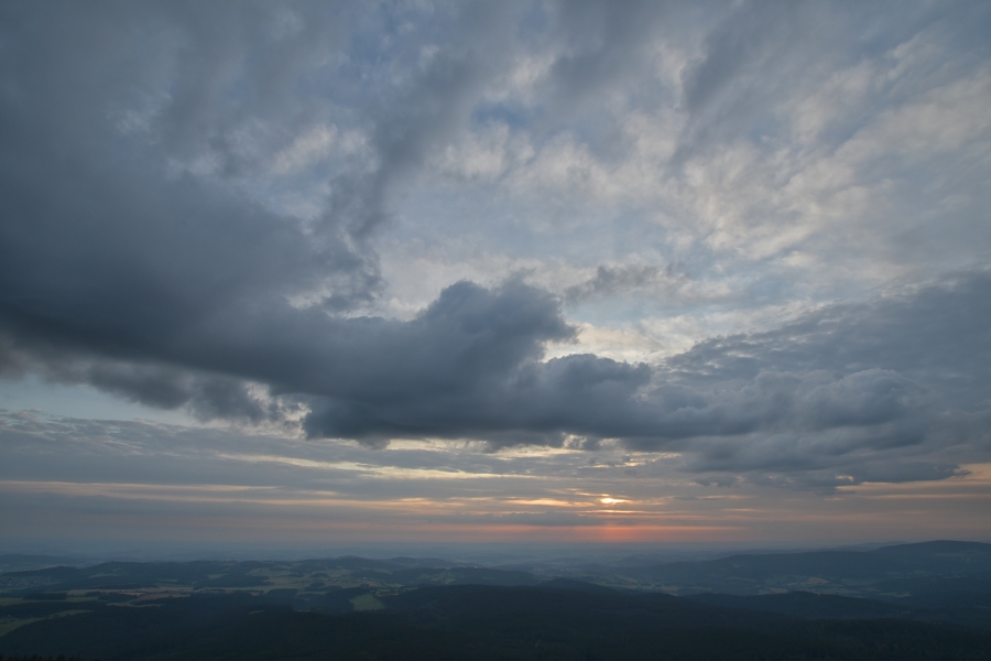 K létu neodmyslitelně patří teplo, ale dnešní zhoupnutí na +27°C, kterážto hodnota by za normálních okolností neměla v dané době působit nijak výjimečně, představovalo v kontextu celého týdne mimořádnou událost. Však jen oproti včerejšku se jednalo o prakticky desetistupňový skok vzhůru, k němuž se navíc obloha pod žhoucím sluníčkem oblékla do zcela čistého blankytu … těžko za takových okolností uvěřit, že to vše by se mělo stát všehovšudy jednodenní záležitostí, již zítra opět vystřídá deštivo. Nač ale mučit mysl otázkami, úvahami a hádankami, je-li možno vypravit se tam, kde lze nalézt odpověď jako na dlani, totiž na Boubín. Ten měl opět v rukávu samá překvapení – především úžasnou bouřkovou oblačnost na západě, zpoza jejíchž charakteristických kovadlin se pokoušely prosadit slabé, sotva zřetelné krepuskulární paprsky ukrytého sluníčka.