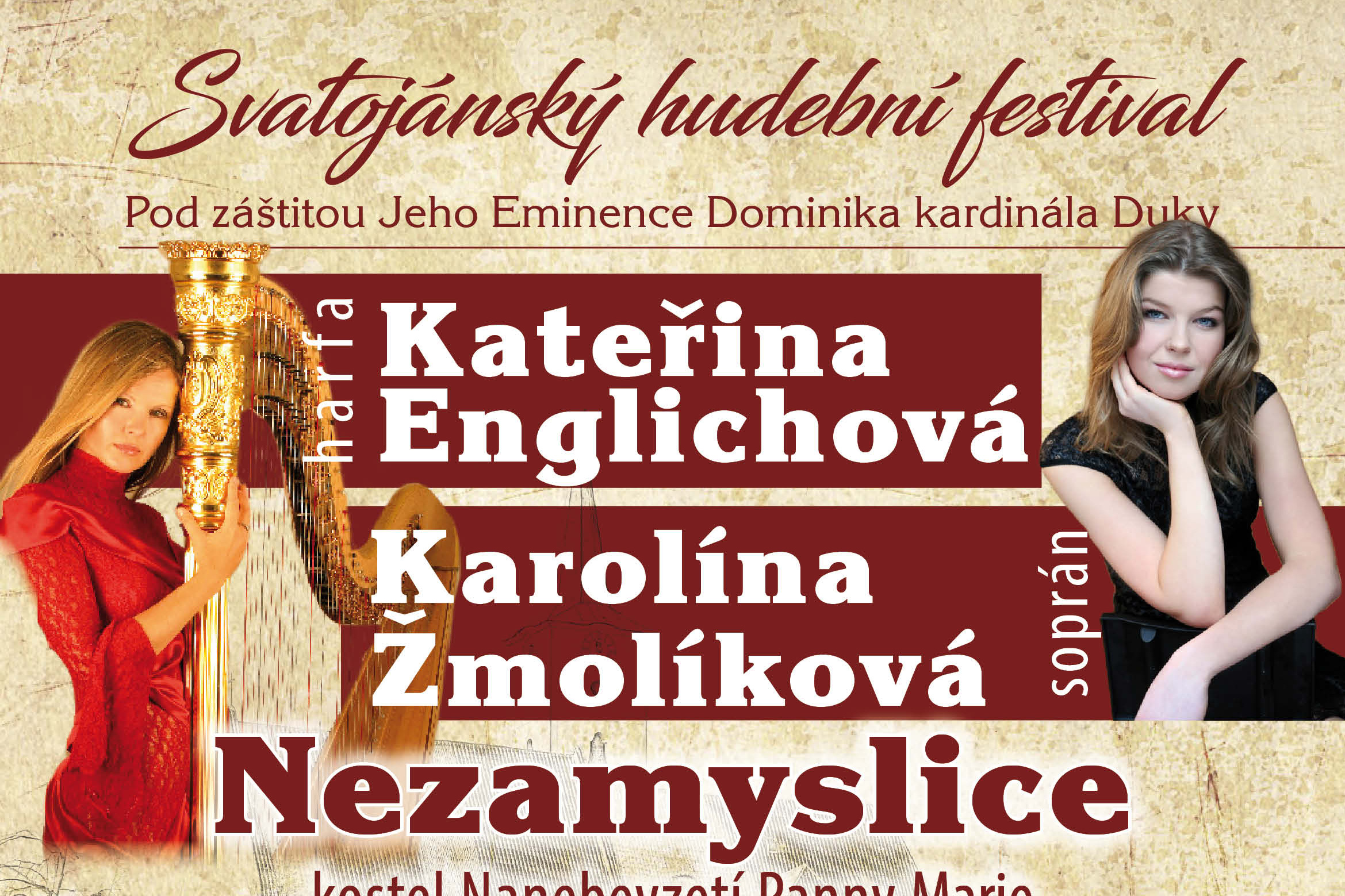 Netradiční spojení harfy, kytary a zpěvu v podání renomovaných umělců slibuje velký zážitek, který umocní prostředí nádherného nezamyslického kostela Nanebevzetí Panny Marie dominujícímu celému pošumaví nebo nově restaurovaného, překrásného kostela sv. Jakuba Většího v Kolinci. V programu kromě jiného zazní Smetanova Vltava v dobové úpravě pro harfu, Dvořákovy Biblické písně a španělské skladby Enriqua Granadose.