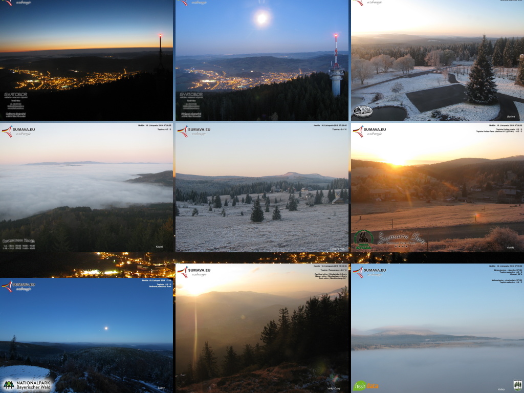 Svítání a soumrak neděle před svatým Martinem zachytily kamery www.sumava.eu. Záběry z jednotlivých míst jsou v rozmezí zhruba 10 hodin (ráno/podvečer). Nejchladnější ráno zaznamenala meteostanice na Perle, ráno v 6.10 hodin, kdy naměřila -11,4°C.