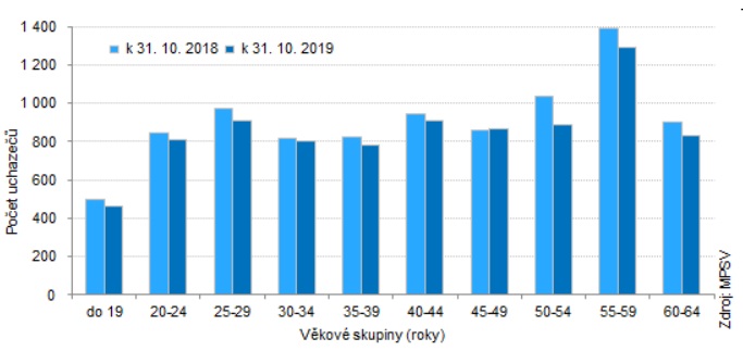 Mezi uchazeči o zaměstnání převládali na konci měsíce října 2019 lidé ve věku 55 až 59 let (1 293), kteří se na celkovém počtu nezaměstnaných podíleli 15 %. Průměrný věk uchazečů o zaměstnání dosáhl v Jihočeském kraji 42,2 let (ve stejném období minulého roku byl průměrný věk nezaměstnaných 41,7 let).