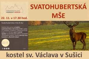 Tradiční slavnost k poctě sv. Hubertovi pořádá letos Řimskokatolická farnost v Sušici v pátek 22. listopadu. Od 17.30 hodin zazní nejprve na náměstí před