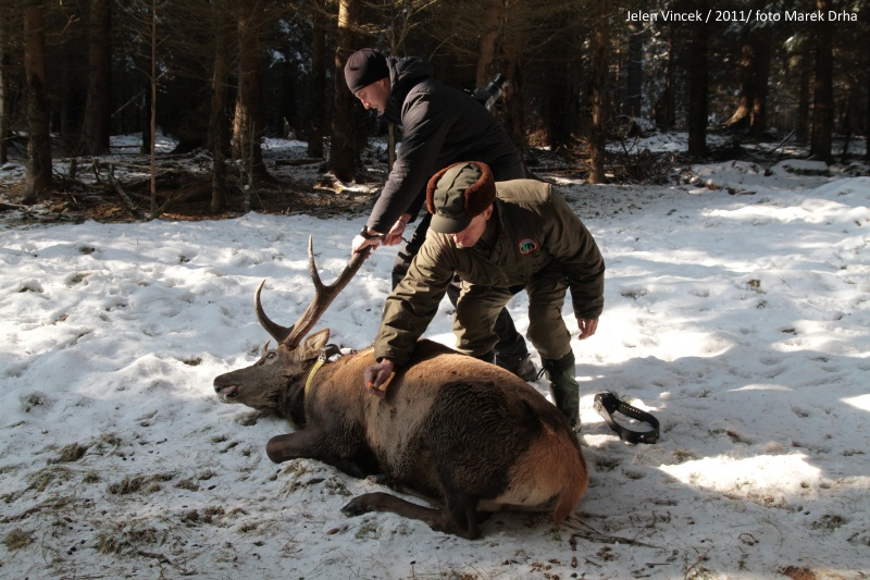 „Během uplynulých dvou předjaří jsme na obou stranách hranice nasadili 72 telemetrických obojků. Obojky zaznamenávají pomocí systému GPS svou pozici a díky zabudované SIM kartě, nám data na dálku posílají. Zhruba po dvou letech od nasazení, se v předem definovaný čas dokáží rozepnout,“ dodává Tomáš Peterka a vzápětí upřesňuje: „Tato poziční data nám budou sloužit k vyhodnocení pohybu sledovaných zvířat, k určení pravidelné zimní a jarní migrace a také ke stanovení prostorových nároků jelenů.“