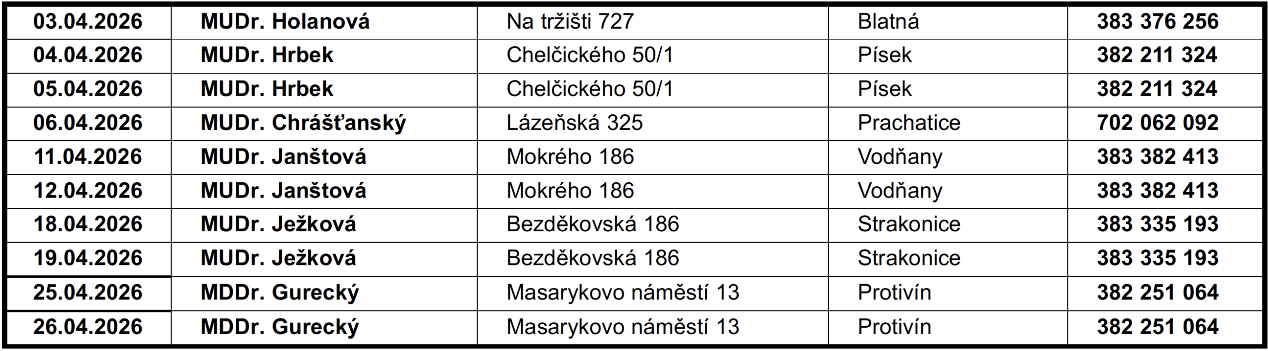 Zubní pohotovost na měsíc DUBEN 2026 pro okresy Písek, Strakonice, Prachatice.