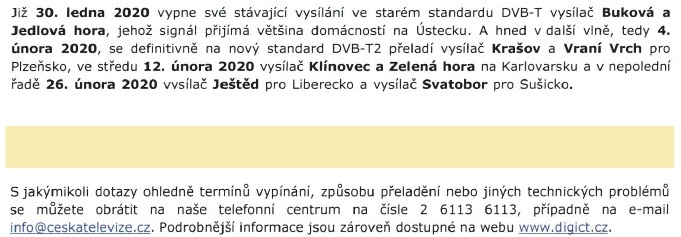- Vypínání sítě DVB-T a zapínání DVB-T2 bude postupné. Jako první došlo k vypnutí sítě DVB-T v Praze a Středočeském kraji a to 27. listopadu 2019. Další vypínání nás čeká začátkem ledna 2020 a bude pokračovat až do konce června 2020. Konkrétní termíny přechodu najdete opět na www.dvbt2overeno.cz.“