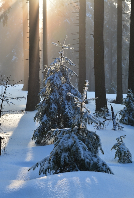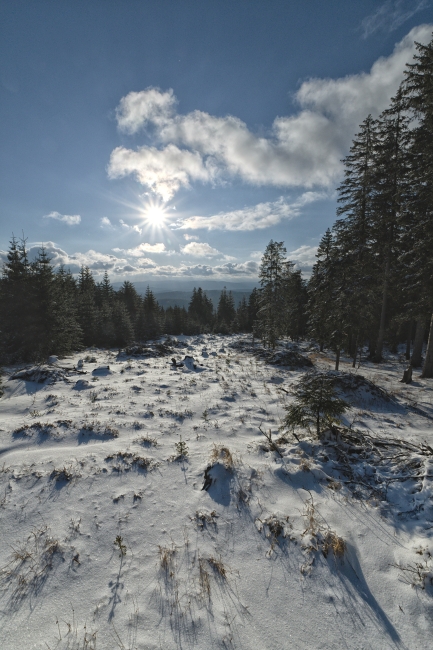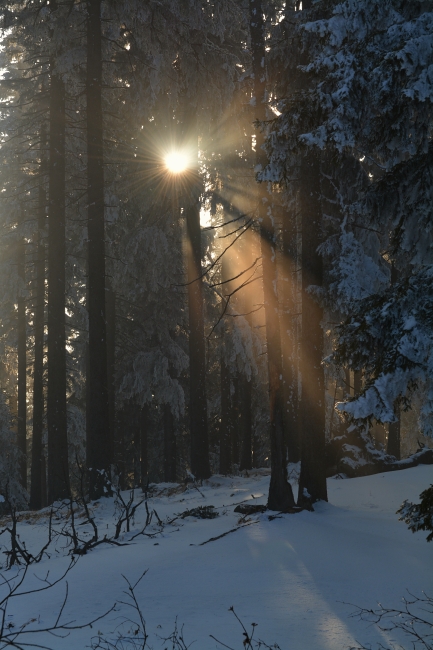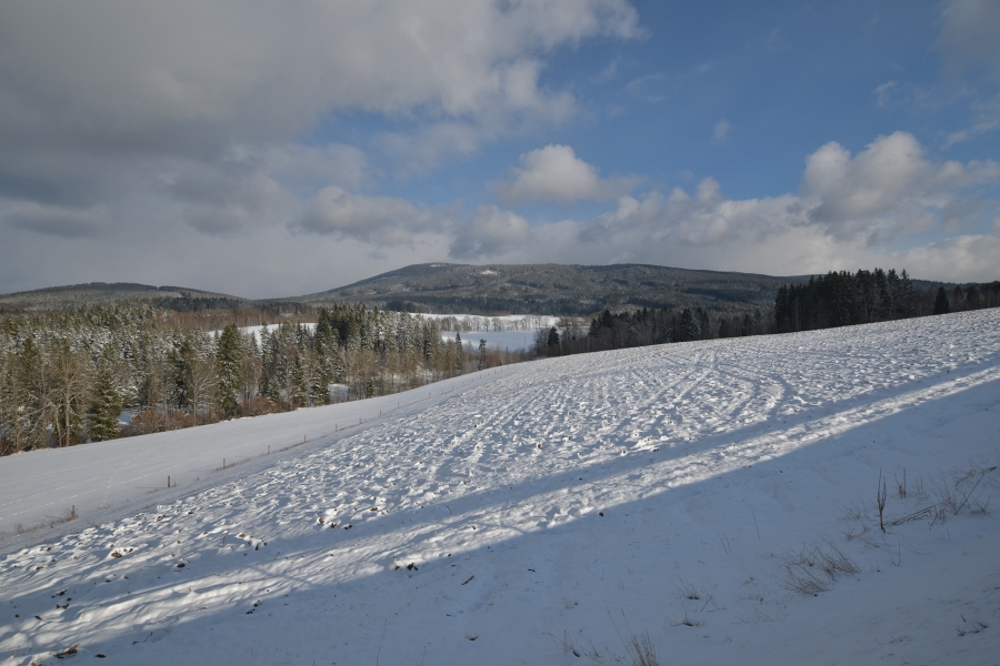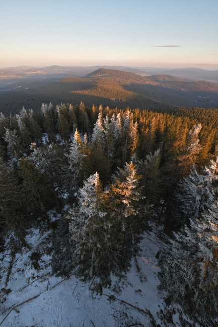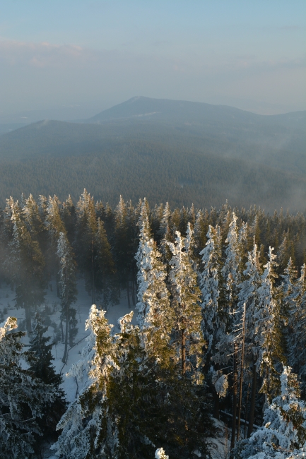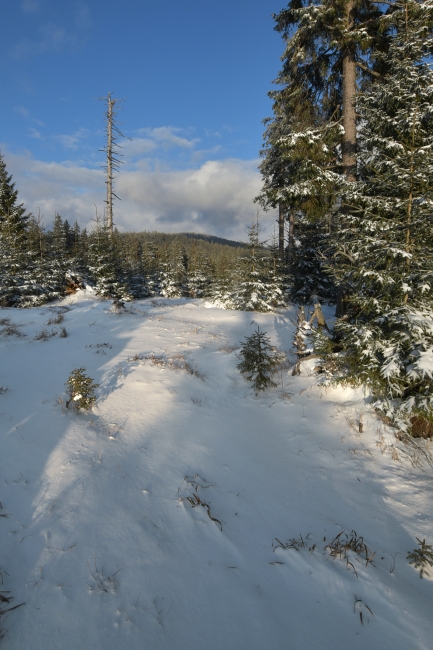 Jediné, co snímek nepřenese, je tahání za nos – tedy nikoli divákův fotografem, nýbrž fotografův mrazíkem. Teploměr již zde, na Basumském hřebeni, ukázal -7°C (vimperská startovní teplota činila +3,5°C).