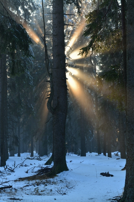 Na Boubín – jako ostatně kamkoli jinam – lze chodit z nejrozmanitějších pohnutek. Tou dnešní bylo otestovat mráz, který by podle předpovědí měl začít slábnout. V okamžiku vimperského startu (cca v 04:20) představoval -7,8°C, zatímco o chvilku později na Kubovce k velkému údivu mírně polevil na -6,5°C. Cestou vzhůru pak dokonce vzbouzel dojem dalšího slábnutí, což však mohlo padat na vrub náhlých závanů překvapivě pocitově vlažného větru. Nahoře ovšem přišel rázný obrat, na jehož upřesnění dojde hned po prohlédnutí drobných zelených záblesků nad vycházejícím sluníčkem.
