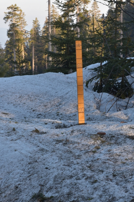 Jiné to však může být na Boubíně, což bude zapotřebí prozkoumat. A vida, mrazík se tu činil rozhodně více – přinejmenším nepřipustil odtávání starých zásob (na den přesně před rokem zde nicméně byla k nalezení stále ještě více než půlmetrová, na vrcholu pak bezmála metrová vrstva sněhu – viz http://vimperk.eu/index.php/vimperk/15444) kolem spodní sněhoměrné tyče.