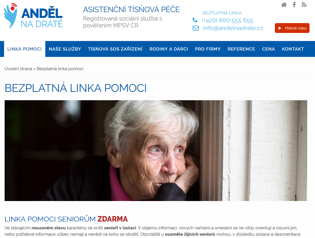 Linka Pomoci seniorům není linkou tísňové péče. Tísňová péče Anděl na drátě je sociální služby určená seniorům u kterých je, v důsledku zhoršování zdravotního stavu, zvýšené riziko pádů či ohrožení zdraví a života. K poskytování této služby je nezbytné SOS komunikační zařízení (chytré hodinky). Nyní poskytujeme toto SOS zařízení včetně služby po dobu omezujících opatření rovněž ZDARMA.