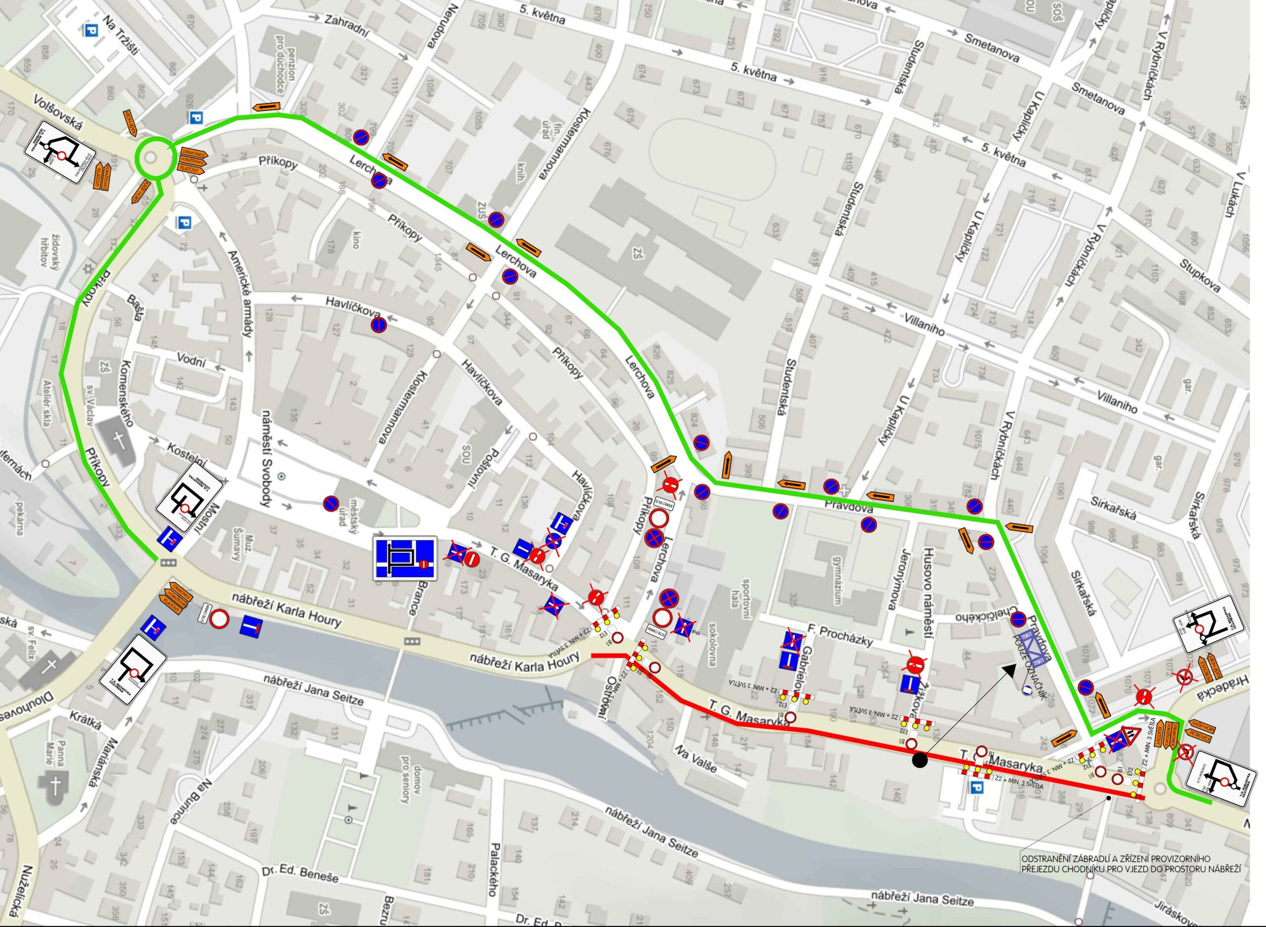 Návrh objízdné trasy naleznete na přiloženém obrázku, objížďka by měla být nepřetržitá v termínu od 4.5.2020 do 20.12.2020, pakliže práce půjdou podle plánu, což nejen v současném nouzovém stavu ale ani v nejistém období po jeho ukončení neumí nikdo 100% zaručit.
