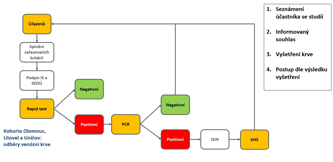 Nezbytnou součástí zařazení do studie je také vyplnění a podepsání Informovaného souhlasu, Souhlasu se zpracováním osobních údajů a vyplnění krátkého dotazníku. Poté následuje odběr krve, a to buď kapilární (z bříška prstu), nebo žilní (v případě Olomouce, Litovle a Uničova). Ihned bude následovat vyšetření protilátek proti SARS-CoV-2, tedy rapid-test. Výsledek bude známý do zhruba 20 minut.