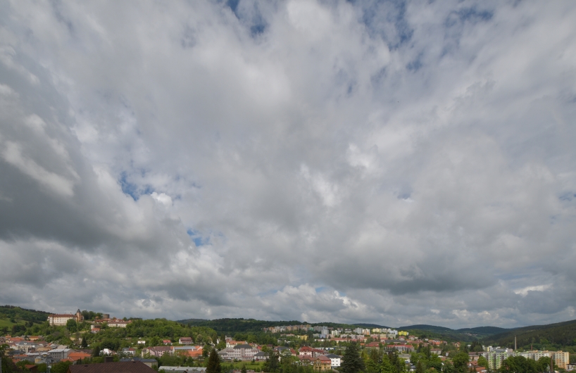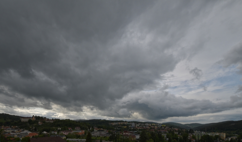 Ještě i dnes se po včerejší vydatné a jistě žádoucí zálivce obloha nad Vimperkem chvílemi zatvářila takhle a podobně, ale již nijak výrazně nekáplo, aniž snad zabouřilo.