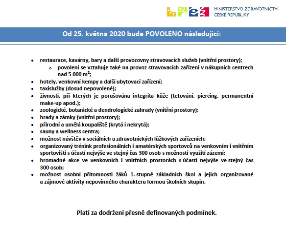 Epidemiologická situace je v ČR stále příznivá. Již v pondělí 25. května tak budou otevírat dlouho očekávané vnitřní prostory restaurací, kaváren, barů a také řada dalších provozů jako jsou hotely, kempy a ostatní ubytovací zařízení. Návštěvníkům budou zpřístupněny také vnitřní prostory hradů a zámků nebo třeba zoologických a dendrologických zahrad. Navíc bude platit mírnější režim pro povinné nošení roušek. Rozvolňování však neznamená opomenutí nezbytných hygienických pravidel.