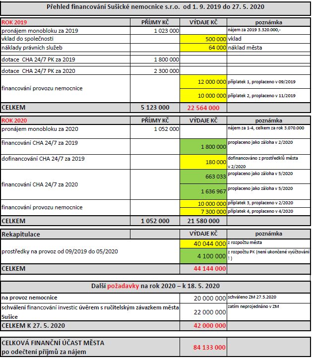 Přehled prostředků vynaložených z rozpočtu města od 1. 9. 2019 do 27. 5. 2020 potvrzuje, že provoz nemocnice je finančně velmi náročný:
