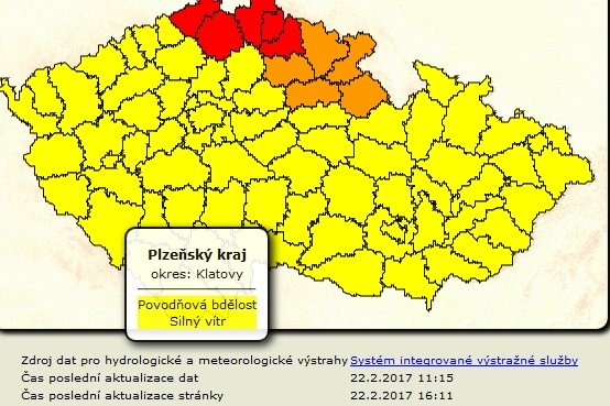 Výstraha před velmi vydatným deštěm, kdy za 24 hodin může napršet více až 80 mm, byla rozšířena na celou ČR z důvodu předpovídaných silných přívalových srážek. V zasažených oblastech mohou hlasiny vodních toků dosáhnout až 2. stupně povodńové aktivity. SPA.