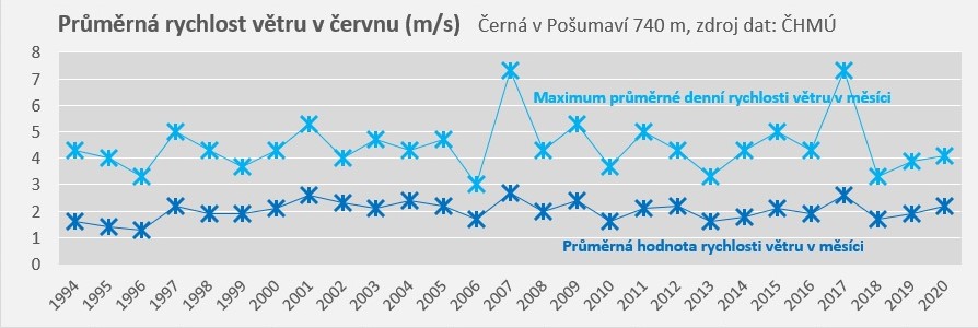 Ani oblast Lipenska nebyla v červnu ušetřena výrazných srážek. Na stanici v Černé v Pošumaví spadlo 213 mm, což řadí červen na 1. místo za posledních 27 let, kdy se zde měří. Tento měsíční úhrn je zajímavý nejen v porovnání s předchozími červny, ale pokud se zaměříme na všechny měsíce roku od začátku měření, byl pouze jediný měsíc za 27 let deštivější a to povodňový srpen roku 2002, kdy spadlo 382 mm srážek.