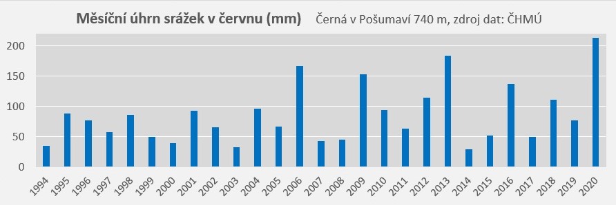 Úhrn srážek v červnu na stanici Černá v Pošumaví od roku 1994 (zaokrouhleno)