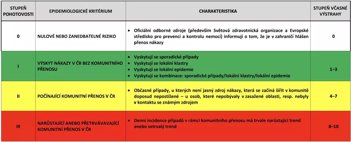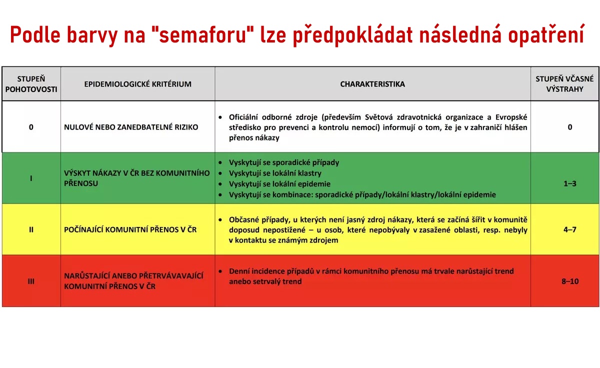 Ministerstvo zdravotnictví ve spolupráci s Ústavem zdravotnických informací a statistiky připravilo systém čtyř stupňů pohotovosti (takzvaný semafor), na které jsou navázány rámcové postupy, činnosti a protiepidemická opatření orgánů ochrany veřejného zdraví.