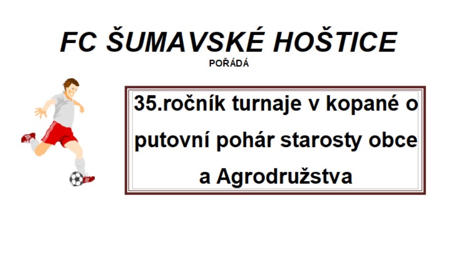 FC Šumavské Hoštice pořádá v sobotu 1.8.2020 35. ročník turnaje v kopané – viz plakát. Od 13:00 hod se v prvním utkání střetnou Šumavské Hoštice s SK Rudolfov B. Ve 2. semifinále pak SK Kvíčovice s SK Čkyně B.