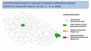 (10. 8.) Ministerstvo zdravotnictví aktualizovalo mapu stupňů pohotovosti podle míry rizika nákazy COVID-19. Stupně pohotovosti vyplývají z aktuální epidemiologické situace. Okresy ČR jsou aktuálně