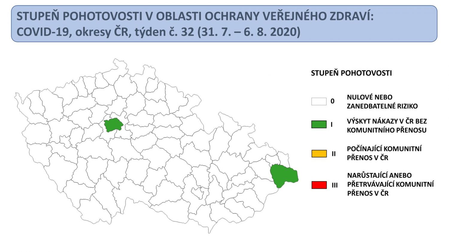 Většina okresů spadá po 32. týdnu (za období 31. 7. – 6. 8. 2020) pod bílou barvu, s nulovým rizikem nákazy. Do zelené barvy, která značí výskyt nákazy bez komunitního přenosu ČR, pak spadají 2 okresy, a sice Praha a Frýdek-Místek. Aktuálně nejvyšší počet osob s covid-19 na 100 tisíc obyvatel je ve Frýdku-Místku (203 na 100 tisíc), Praha má počet nižší (89 na 100 tisíc). Nejvyšší počet nově diagnostikovaných za posledních 7 dní na 100 tisíc obyvatel zaznamenal opět Frýdek-Místek (82,9 na 100 tisíc), Praha méně (24,9 na 100 tisíc).