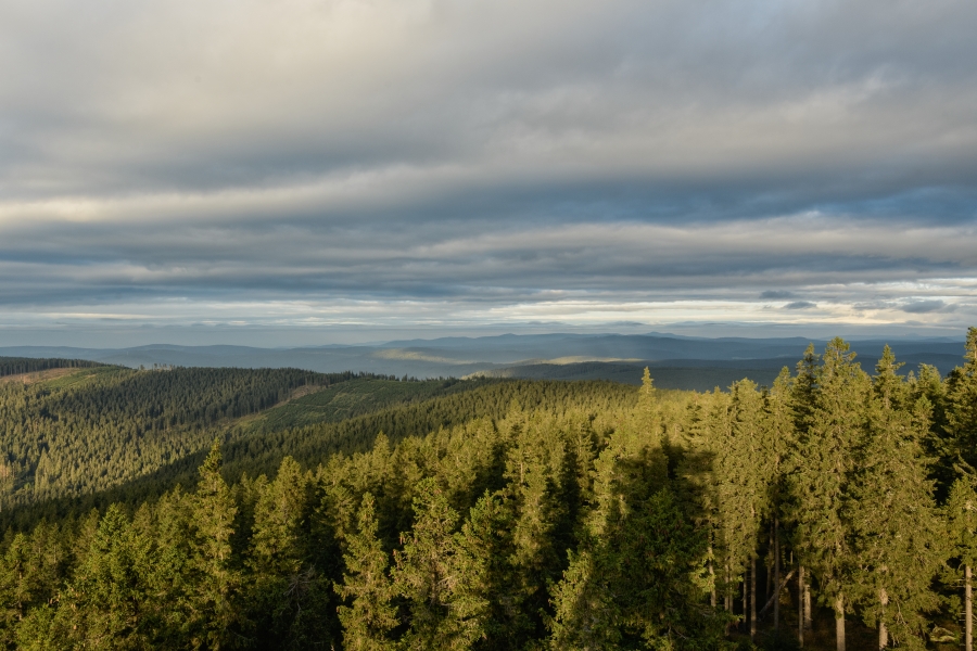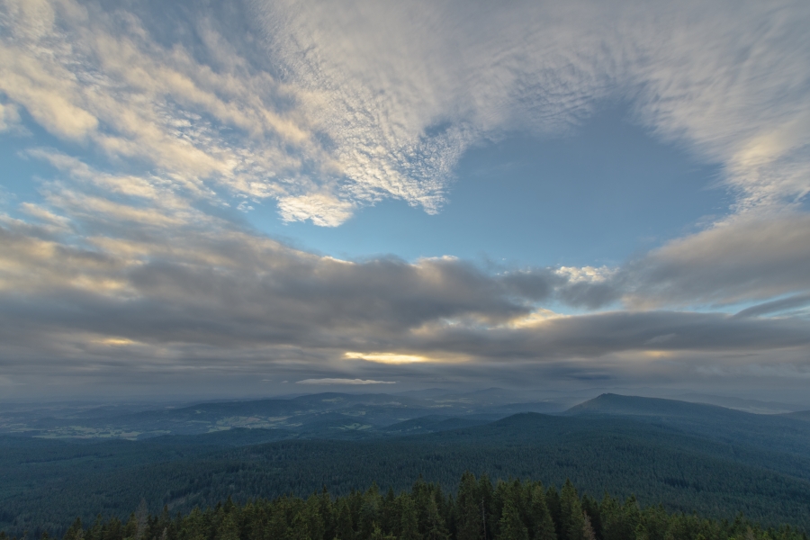 Ten již pohledem od Korkusovky prozradil pokusy nízké oblačnosti nasadit mu obvyklou čepičku, ale těsně pod vrcholem následně překvapil nečekanou možností osobně se nad víceméně čistým západním obzorem rozloučit se sluníčkem, do té vzácné chvíle neviditelným. Současně však začalo být jasné, že rozhledna nabídne zcela jiné výjevy.