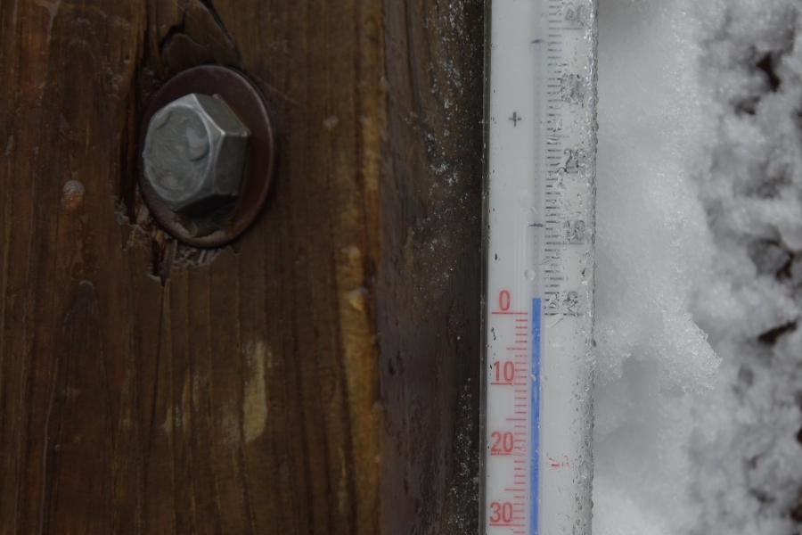 … takřka neustále hnal celá hejna bílých vloček vítr o nárazové rychlosti 8,3 m/s (29,88 km/h). Teplotě, jak vidno, už mnoho k bodu mrazu nescházelo.