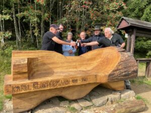 Druhá Klostermannova lavička křtěná pivem Klostermann stojí nedaleko Srní Polotmavým pivem Klostermann byla pokřtěna lavička Karla Klostermanna, která nově