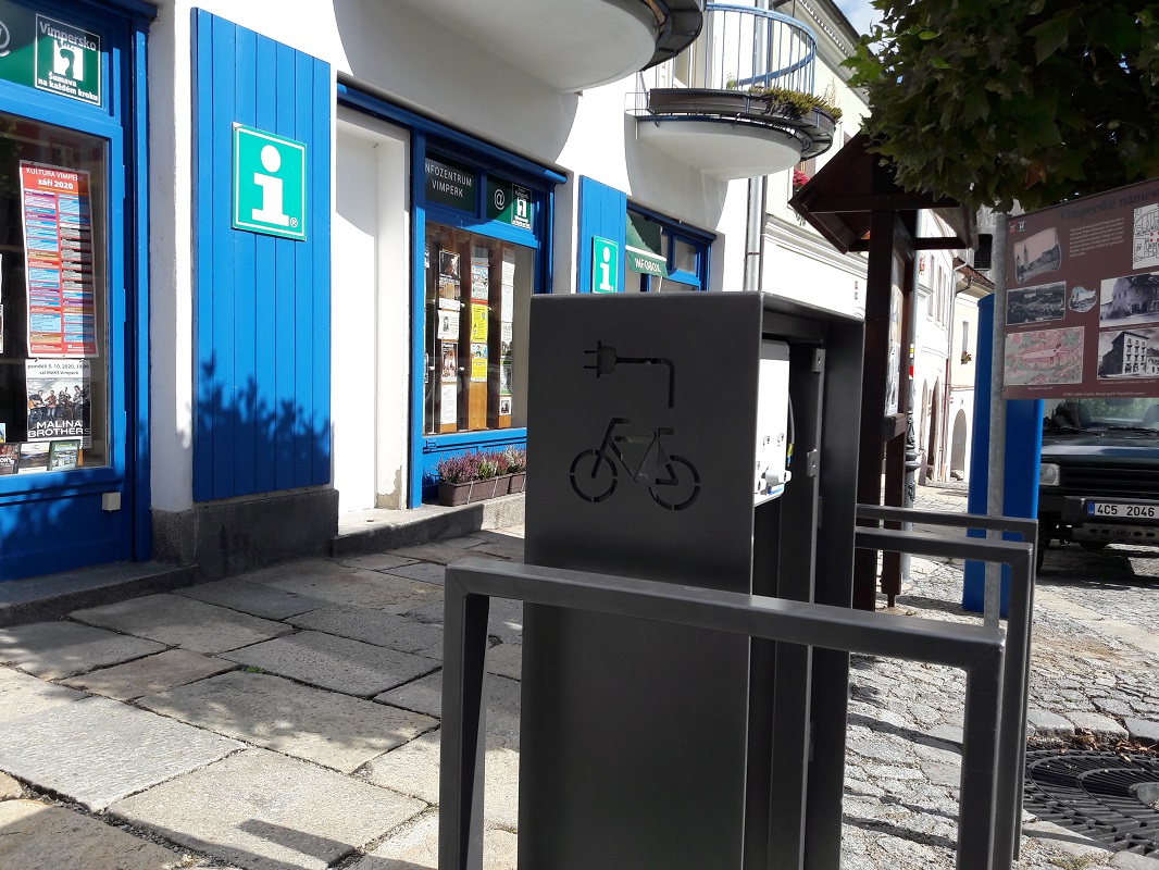 Fotografie nabíjecí stanice pro elektrokola na náměstí: