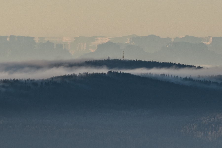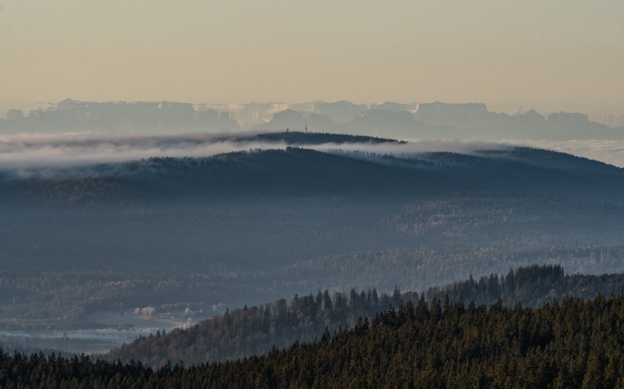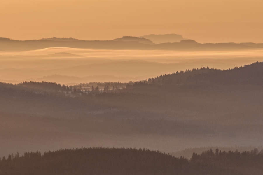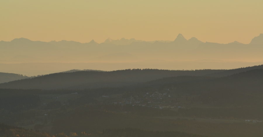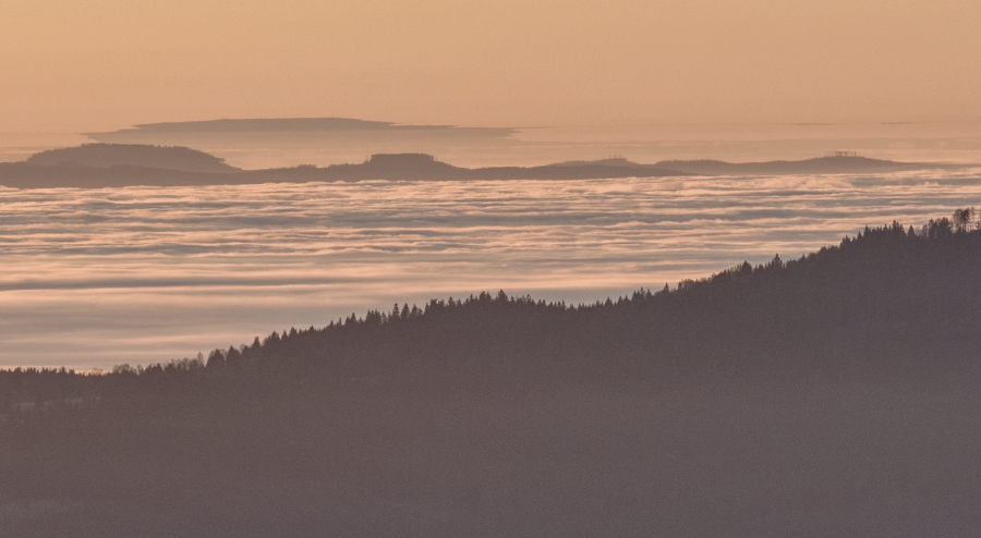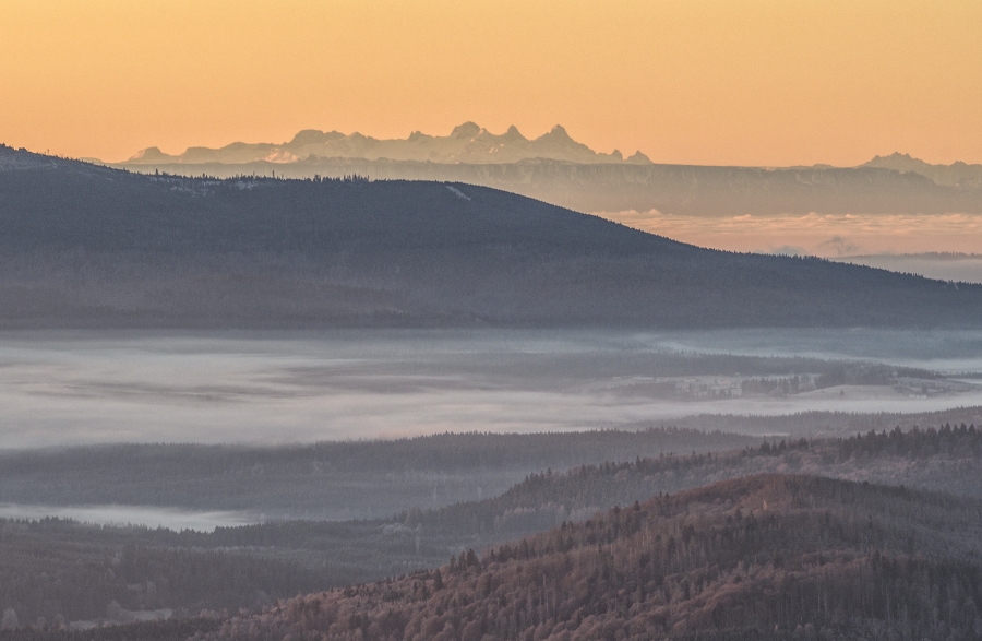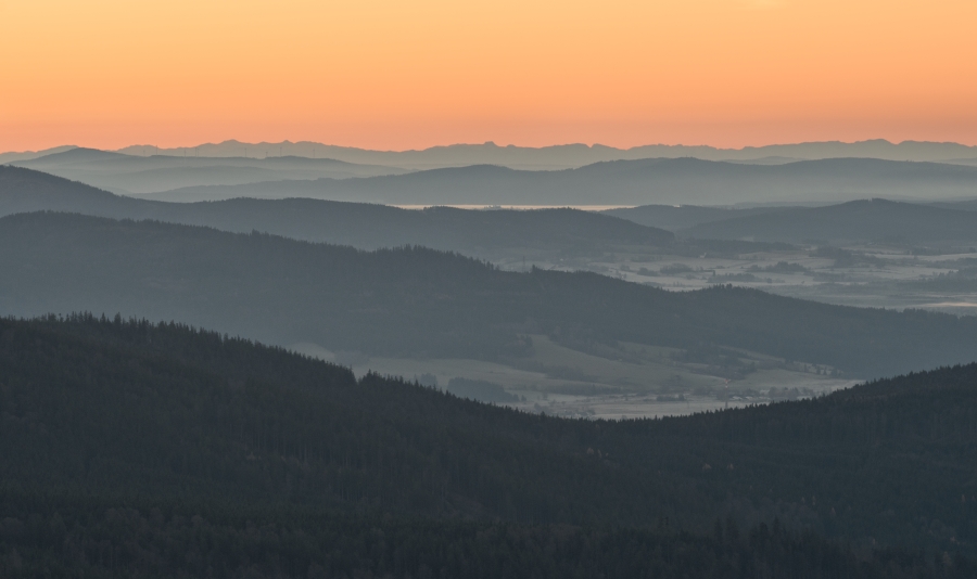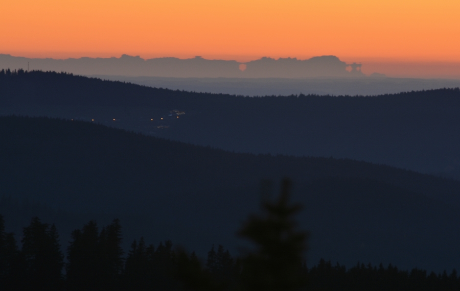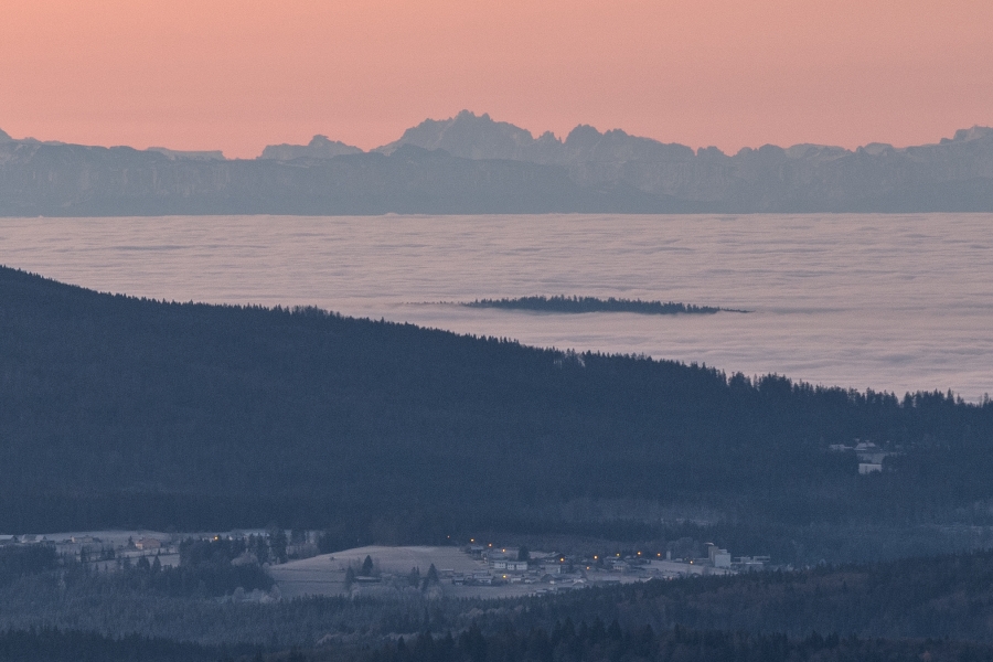 Krátce po včerejším poledni Vimperk skutečně kompletně zmizel pod inverzní hladinou, ovšem ještě před půlnocí opět začaly shora prosvítat první hvězdy. Ranní teplota tu sice sestoupila na -6°C, což za poslední dny představovalo nejsilnější vimperský mrazík, ale pohled z boubínské rozhledny pasoval inverzní hladinu na zbabělého dezertéra, kterýžto vojenský termín byl diktován fotografovým neskrývaným zklamáním nad ztrátou téměř s jistotou (byť okořeněnou i nepatrnou pochybností) očekávaných efektních záběrů oblačného oceánu. Na druhé straně však bylo možno prozkoumat, jak si za stále přetrvávající teplotní inverze povede již včera slábnoucí atmosférické zrcadlení. Alpská panoramata ve většině případů vykazovala až na drobné výjimky návrat do běžného normálu, ale tím více dala vyniknout nespornému králi letošních fata morgán, …