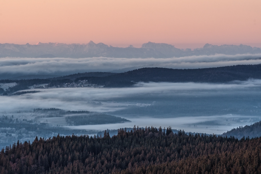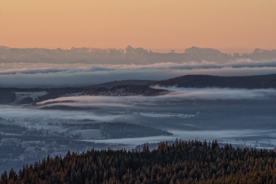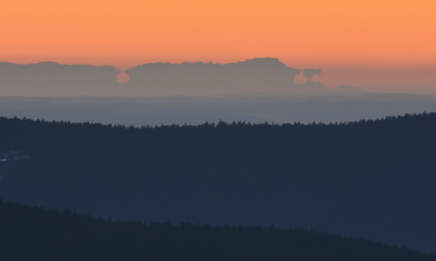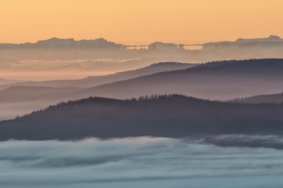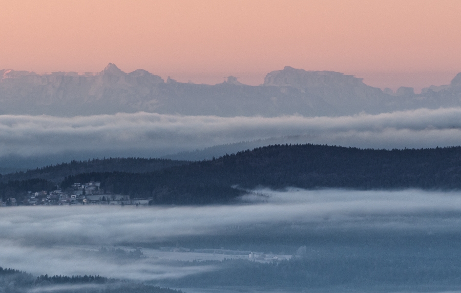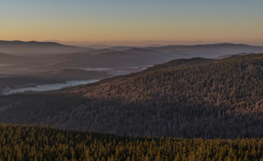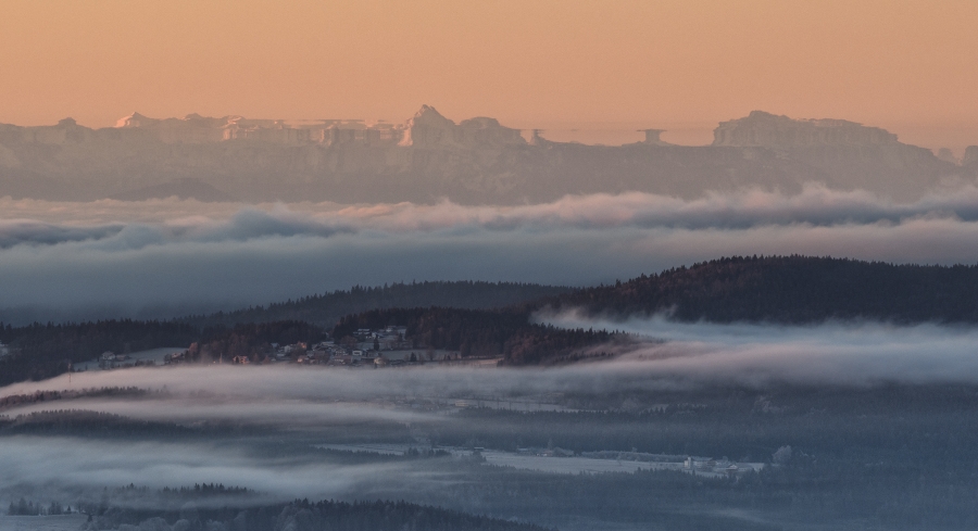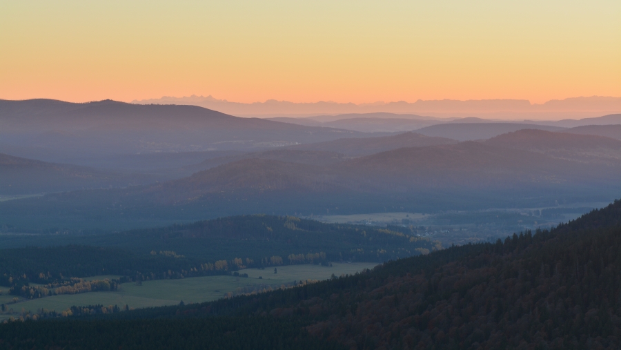Krátce po včerejším poledni Vimperk skutečně kompletně zmizel pod inverzní hladinou, ovšem ještě před půlnocí opět začaly shora prosvítat první hvězdy. Ranní teplota tu sice sestoupila na -6°C, což za poslední dny představovalo nejsilnější vimperský mrazík, ale pohled z boubínské rozhledny pasoval inverzní hladinu na zbabělého dezertéra, kterýžto vojenský termín byl diktován fotografovým neskrývaným zklamáním nad ztrátou téměř s jistotou (byť okořeněnou i nepatrnou pochybností) očekávaných efektních záběrů oblačného oceánu. Na druhé straně však bylo možno prozkoumat, jak si za stále přetrvávající teplotní inverze povede již včera slábnoucí atmosférické zrcadlení. Alpská panoramata ve většině případů vykazovala až na drobné výjimky návrat do běžného normálu, ale tím více dala vyniknout nespornému králi letošních fata morgán, …