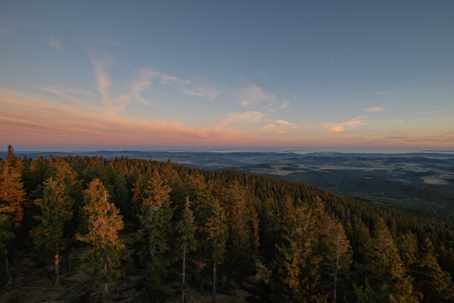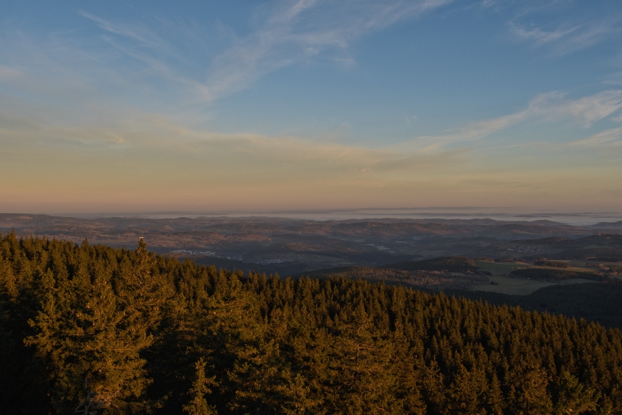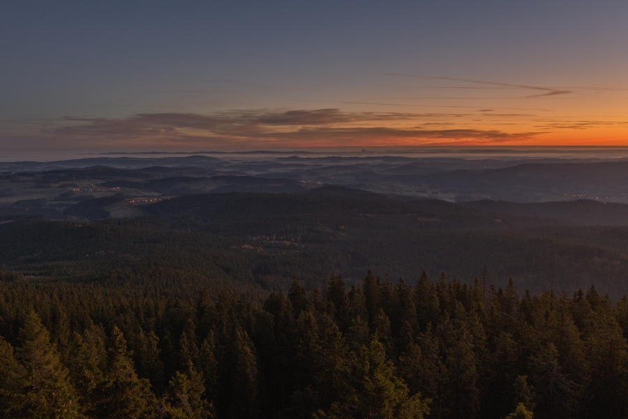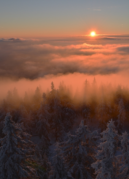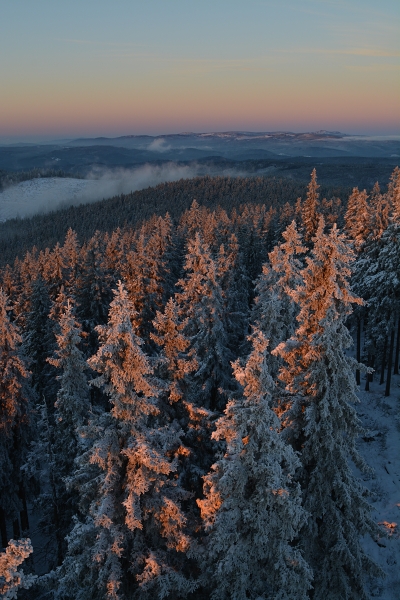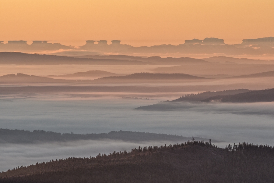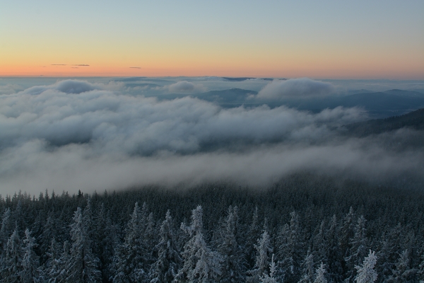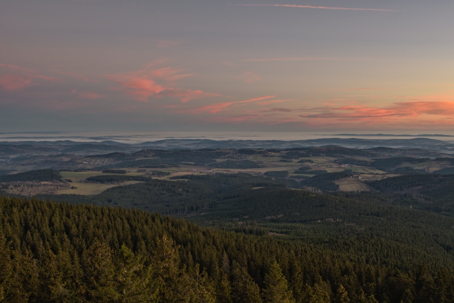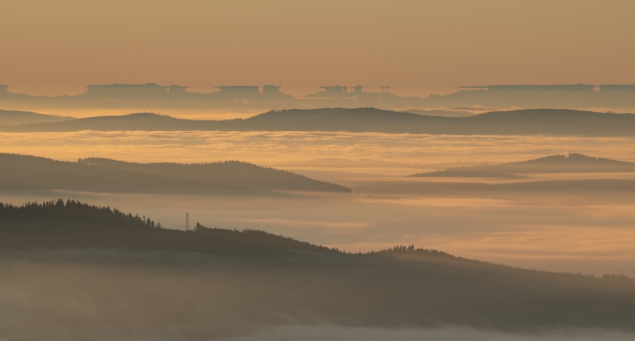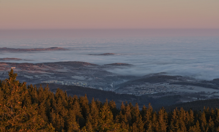 Ohlašované změny počasí jsou, zvláště slibují-li návrat mlh, nemalými výzvami k vytrvalému sledování celé situace z patřičného nadhledu. Proto i navzdory pro fotografa lehce hororové vidině (jejíž pravděpodobnost dnes navíc hraničila s jistotou), že totiž vyhlídková plošina rozhledny zase jednou „zapraská ve švech“ přílivem jinak zcela pochopitelné spousty dalších zájemců (čímž vezme zasvé možnost nejen smysluplně exponovat potřebnými dlouhými časy, ale mít vůbec šanci volného pohybu k vyhledání a přípravě nejideálnějšího záběru), nemohl v ranním programu scházet výstup na Boubín. Zábleskem štěstí byla snad jen skutečnost, že šestadvacet dále postupně dorazivších svátečních víkendových nadšenců si přece jen pozoruhodně přispalo o cca půl hodinky déle, takže první záběry byly ušetřeny ničivého chvění rozhledny. Skutečně prozradily znatelný vzestup inverzní hladiny, …