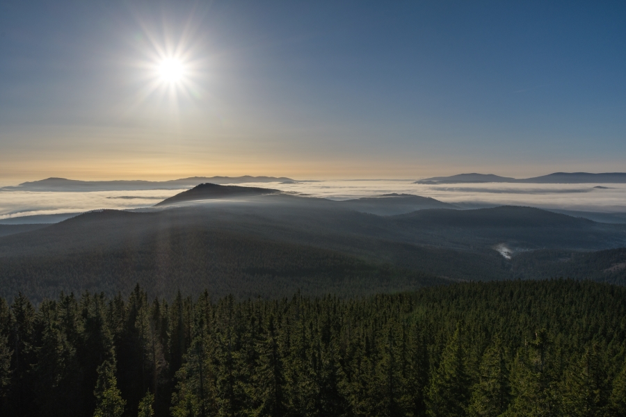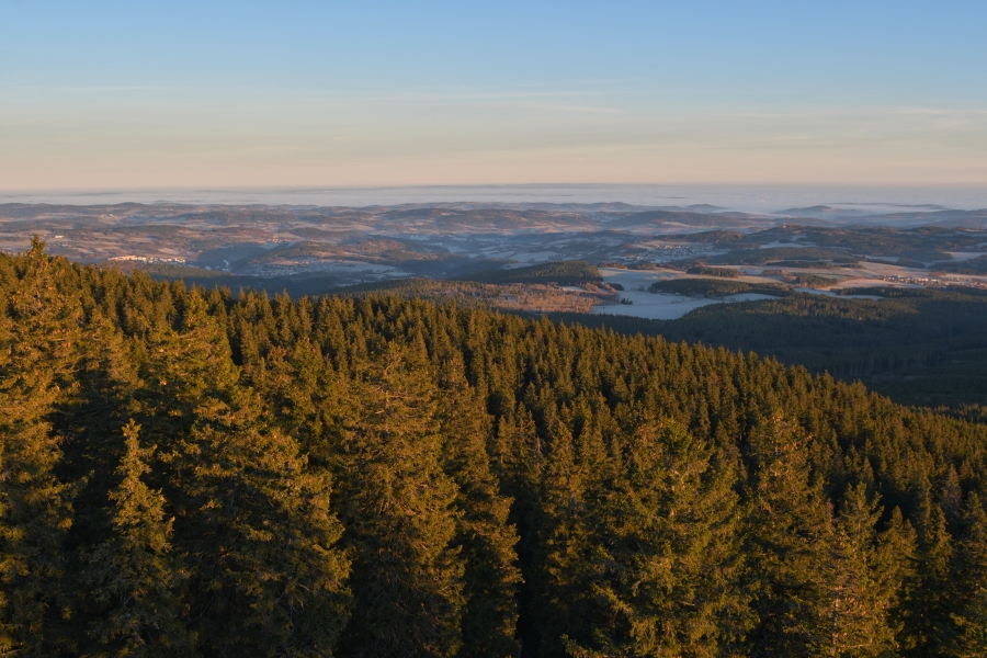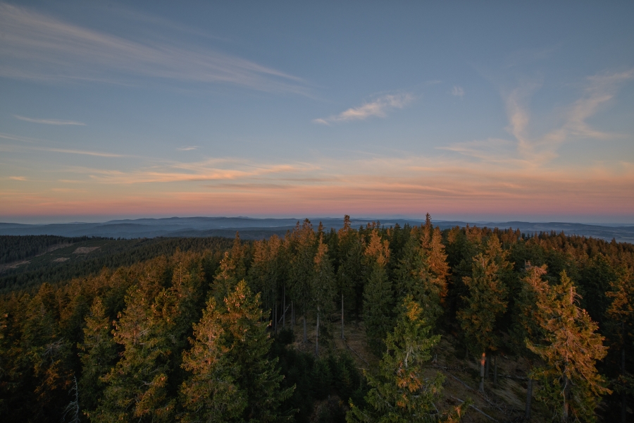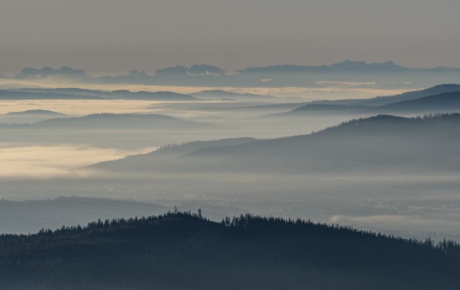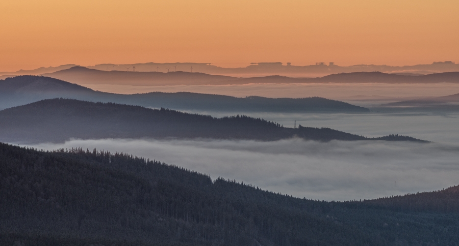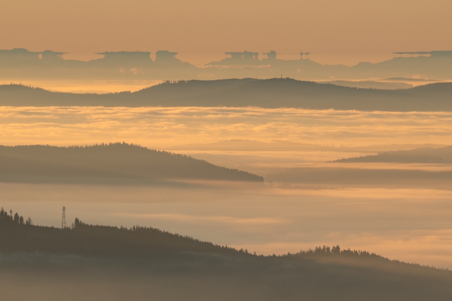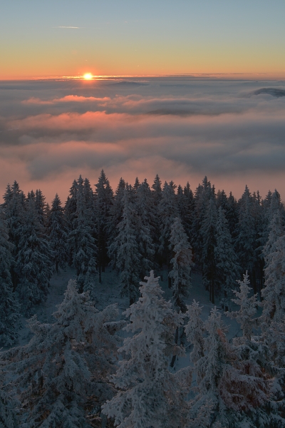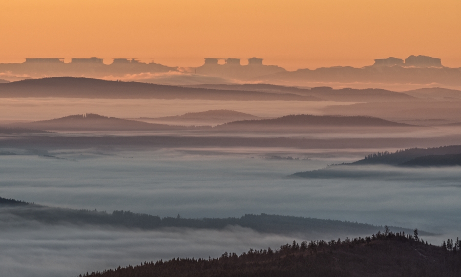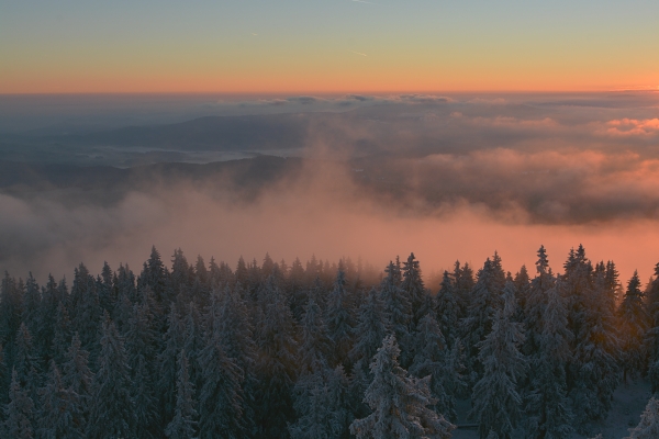 Ohlašované změny počasí jsou, zvláště slibují-li návrat mlh, nemalými výzvami k vytrvalému sledování celé situace z patřičného nadhledu. Proto i navzdory pro fotografa lehce hororové vidině (jejíž pravděpodobnost dnes navíc hraničila s jistotou), že totiž vyhlídková plošina rozhledny zase jednou „zapraská ve švech“ přílivem jinak zcela pochopitelné spousty dalších zájemců (čímž vezme zasvé možnost nejen smysluplně exponovat potřebnými dlouhými časy, ale mít vůbec šanci volného pohybu k vyhledání a přípravě nejideálnějšího záběru), nemohl v ranním programu scházet výstup na Boubín. Zábleskem štěstí byla snad jen skutečnost, že šestadvacet dále postupně dorazivších svátečních víkendových nadšenců si přece jen pozoruhodně přispalo o cca půl hodinky déle, takže první záběry byly ušetřeny ničivého chvění rozhledny. Skutečně prozradily znatelný vzestup inverzní hladiny, …