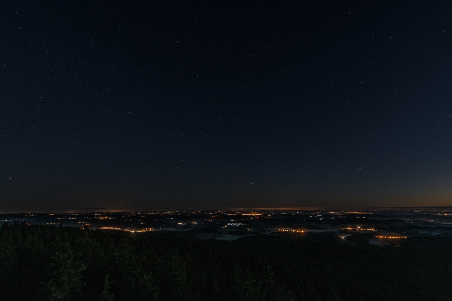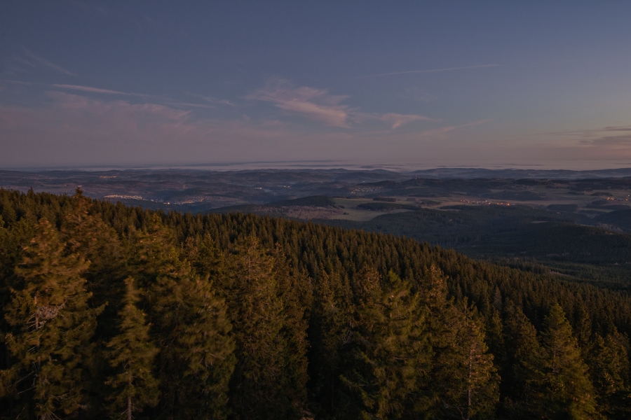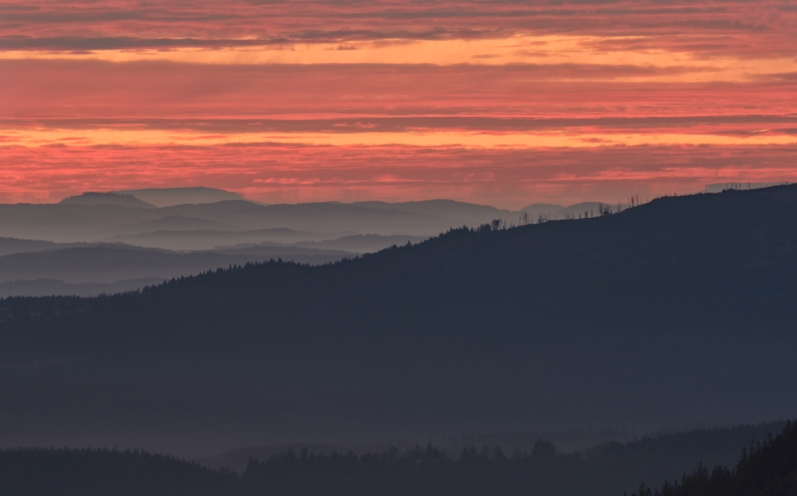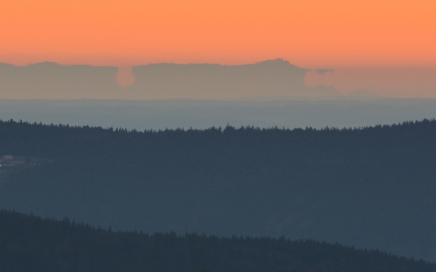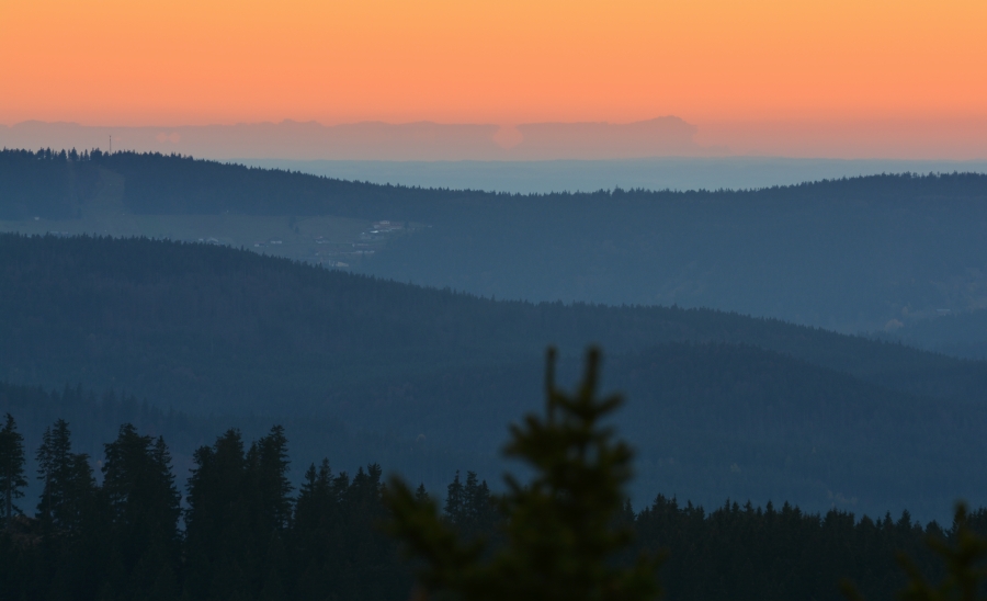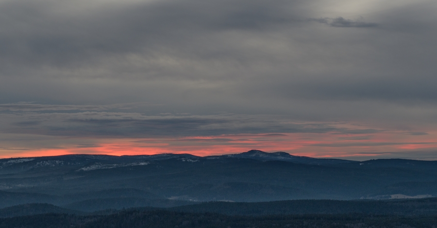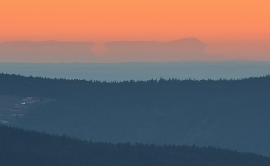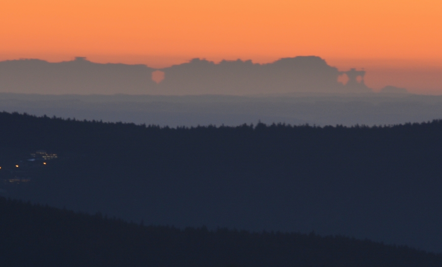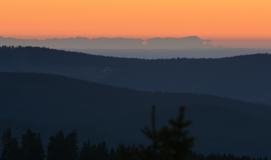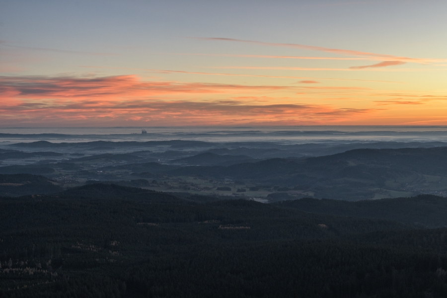 Ani tentokrát nám však příroda nezůstala dlužna úchvatné kouzlo. Na obzoru nad rakouskou příhraniční horou Bärenstein – St. Martin (1003 m n.m., 77,7 km) jako by krátce před slunečním východem přímo vzplál do té chvíle neviditelný zvláštní mrak.