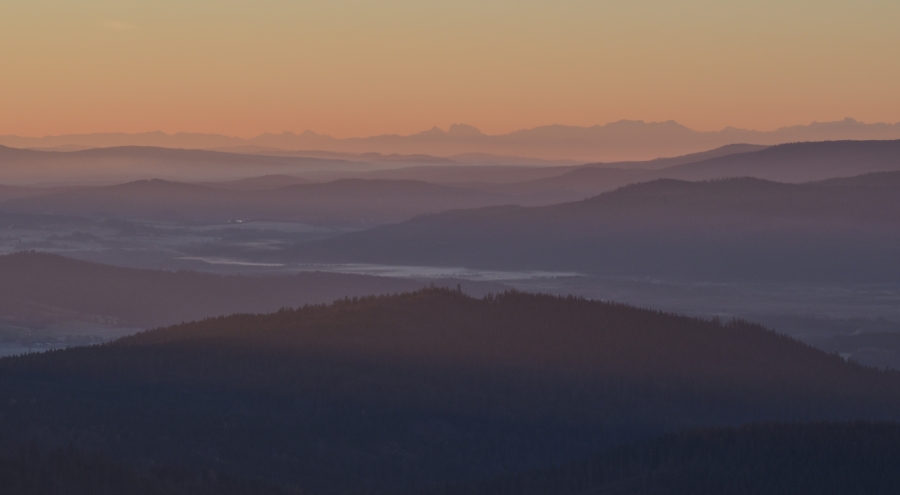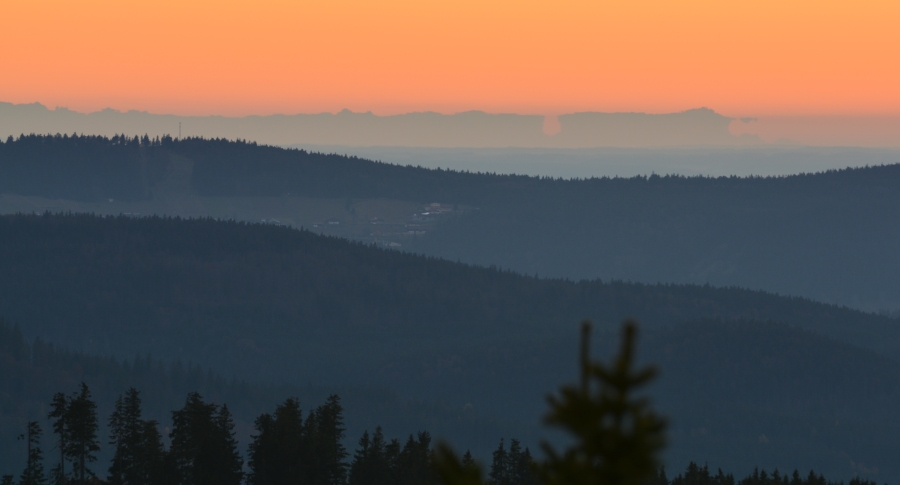 Po třech celkem si podobných dnech se opět blíží změna počasí – hlášena je slabá studená fronta a přibývající mlhy. Do jaké míry se budou týkat Šumavy, uvidíme nejspíš až zítra. Již dnes je ovšem možno konstatovat, že časně ranní mrazík povolil ve Vimperku oproti včerejším šesti stupňům na pouhé dva a cesta na Boubín nepředstavovala tak výrazný pocitový tepelný kontrast jako tři předchozí. Jinou náladou se prezentoval i první pohled z věže do krajiny, s přibývající dálkou se jevící, jako by byla zastřena jemným rozostřujícím a živost barev do pastelova tlumícím závojem. Ten však nebránil stále dokonalé čitelnosti alpských vrcholů, dnes již sice nezrcadlících do podoby bizarních novotvarů (ani v případě včera ještě excelujícího Klosterwappenu), ale přece jen opticky vystupujících oproti běžnému normálu poněkud výše. Při větším přiblížení to bylo dobře pozorovatelné třeba za Plechým na Grosser Prielu (první špičatý vrchol vpravo – 2515 m n.m., 142,9 km) i na něj dále navazujících masivech Ďáblovy a Rybářské (danému kontextu by zajisté mnohem více vyhovoval překlad Andělské) zdi – Teufelsmauer (2185 m n.m., 141,3 km) a Angelmauer (2102 m n.m., 141,4 km).