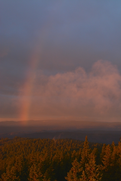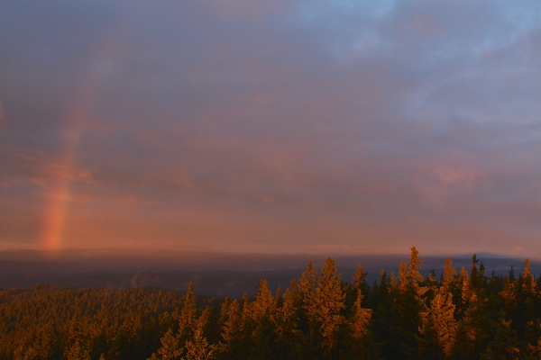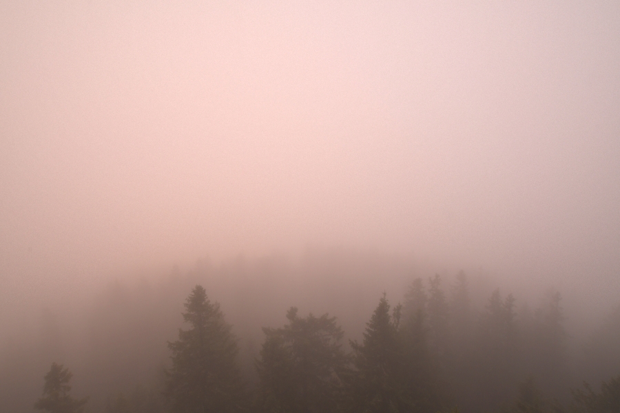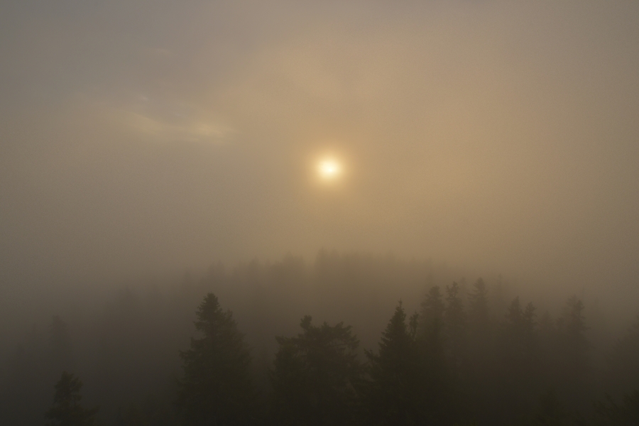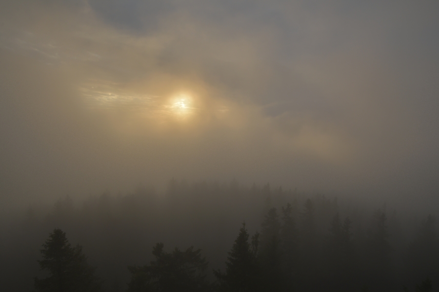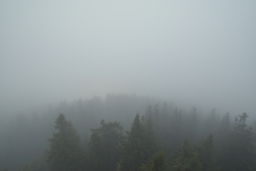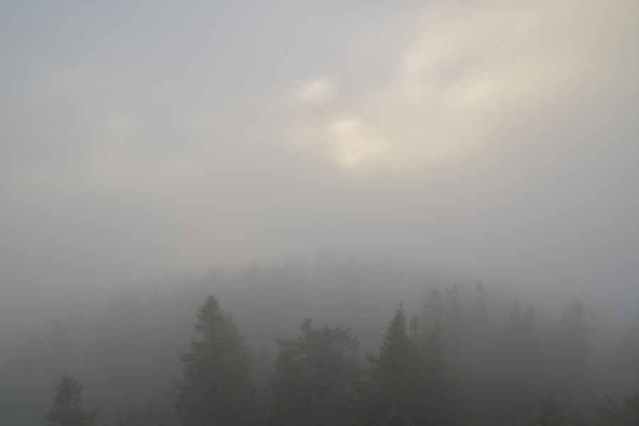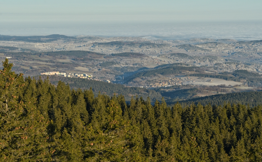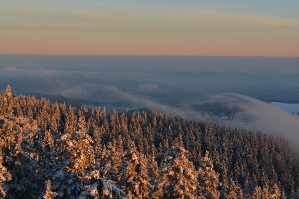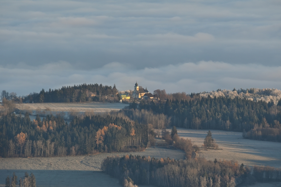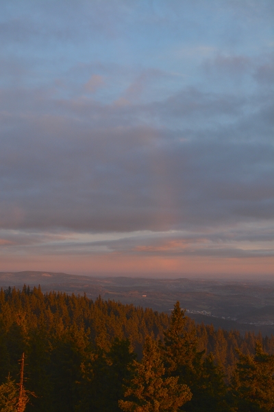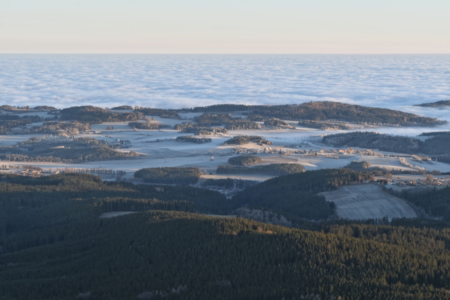 Ještě že laskavá příroda dokáže přispěchat s hojivou náplastí – zde v podobě slabého náznaku počátku bílé duhy v mlžné cloně nad Vimperkem, který se dle všeho ještě dnes působením sluníčka dokáže osvobodit z toho, co pohledem z Boubína vypadalo pro obyvatele města mnohem bezvýchodněji.