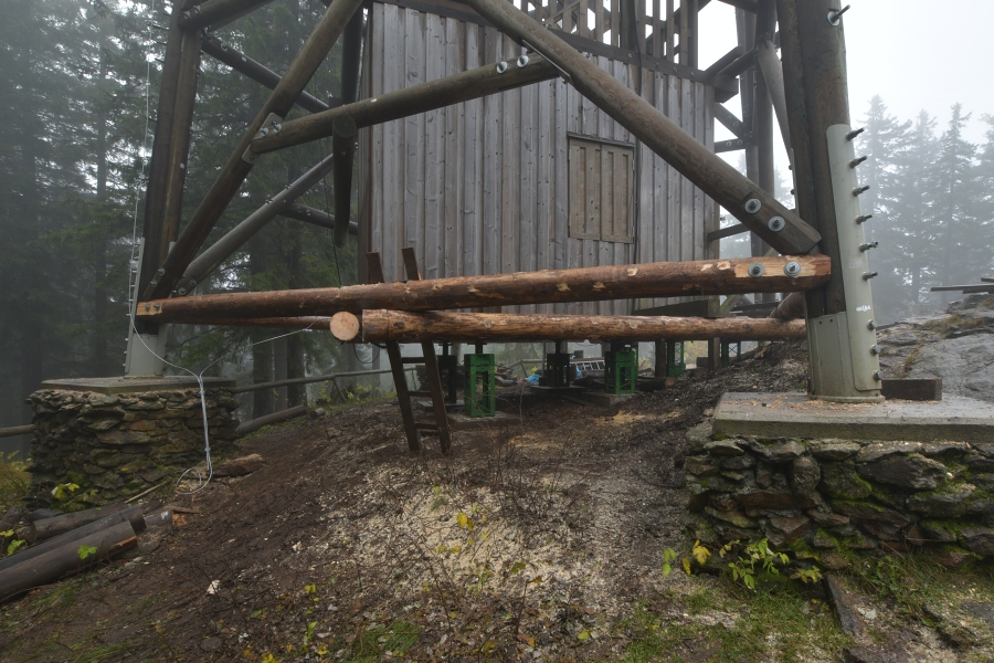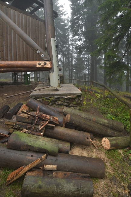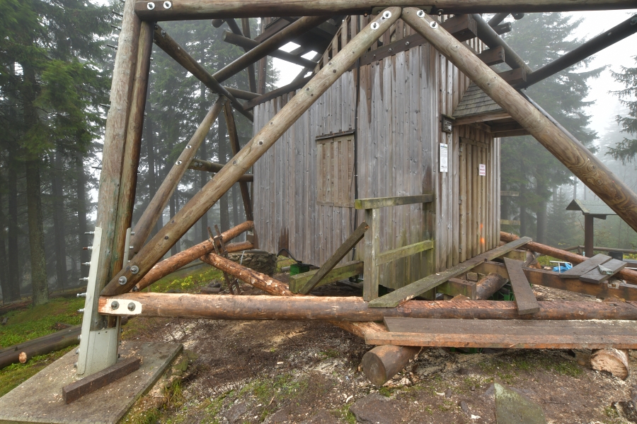 Čerstvé odstranění celé vchodové stěny je neklamnou známkou toho, že se tu patrně brzy setkáme se slibovaným turniketem, který završí jeden a půl měsíce trvající opravné a rekonstrukční práce a současně ukončí bezmála šestnáctiletou éru volného vstupu na nejvyšší vyhlídkové místo české části Šumavy.