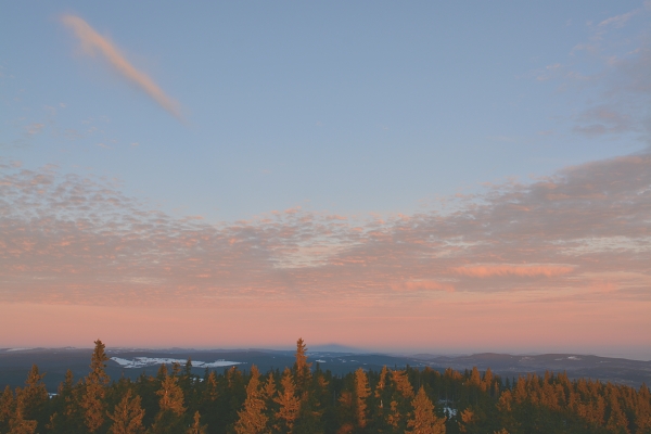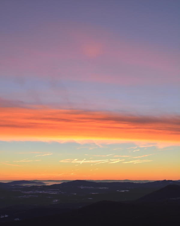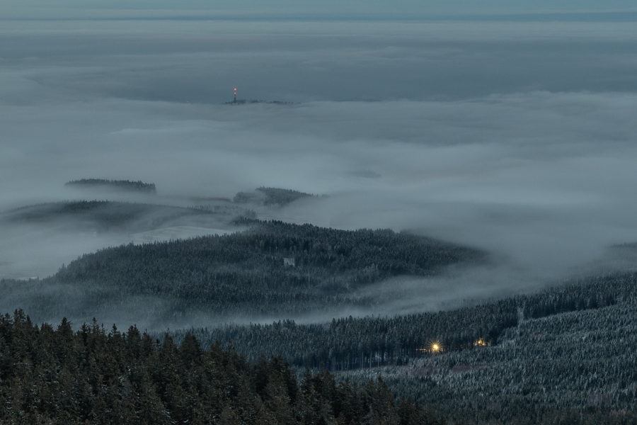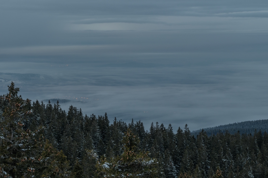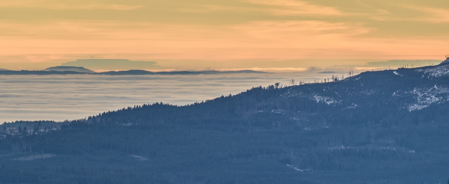 Sluníčko se přece naposledy rozmáchlo a zvolilo okamžiky po svém rozloučení, v nichž sváteční večerní modř pozvolna ustoupila stále temnější šedi. Současně vyšlo najevo, že inverzní oceán dosud nenabyl obvyklé síly, jestliže skrze svou hladinu bohatě propustil světla Vimperka, s nimiž se shora zdravil blikající maják Mařského vrchu. A Vánoce pokračují …