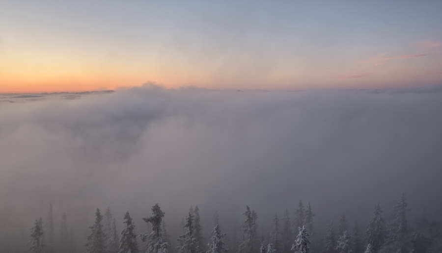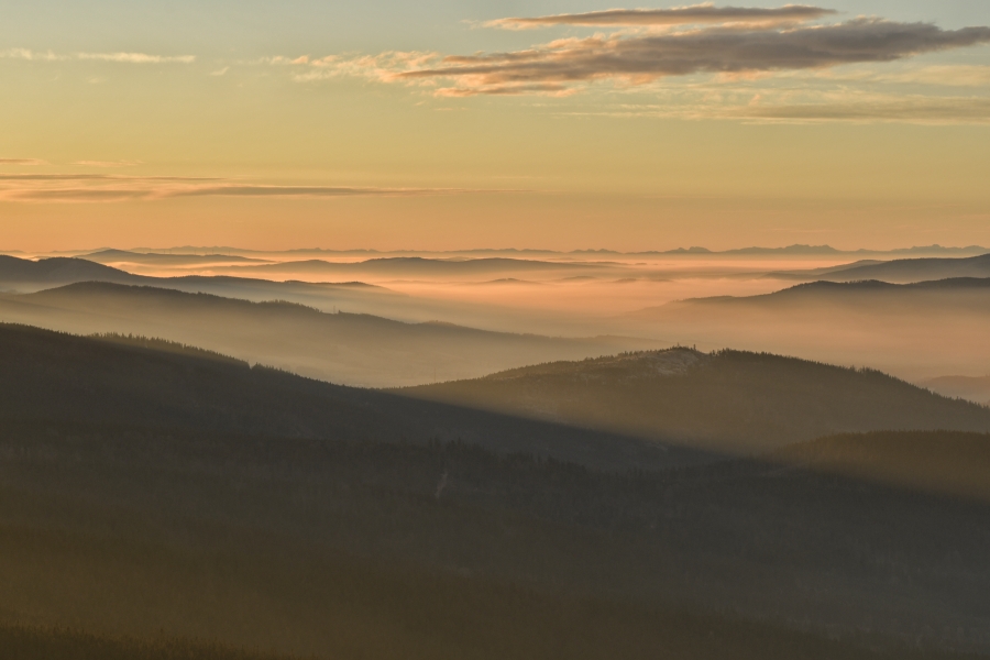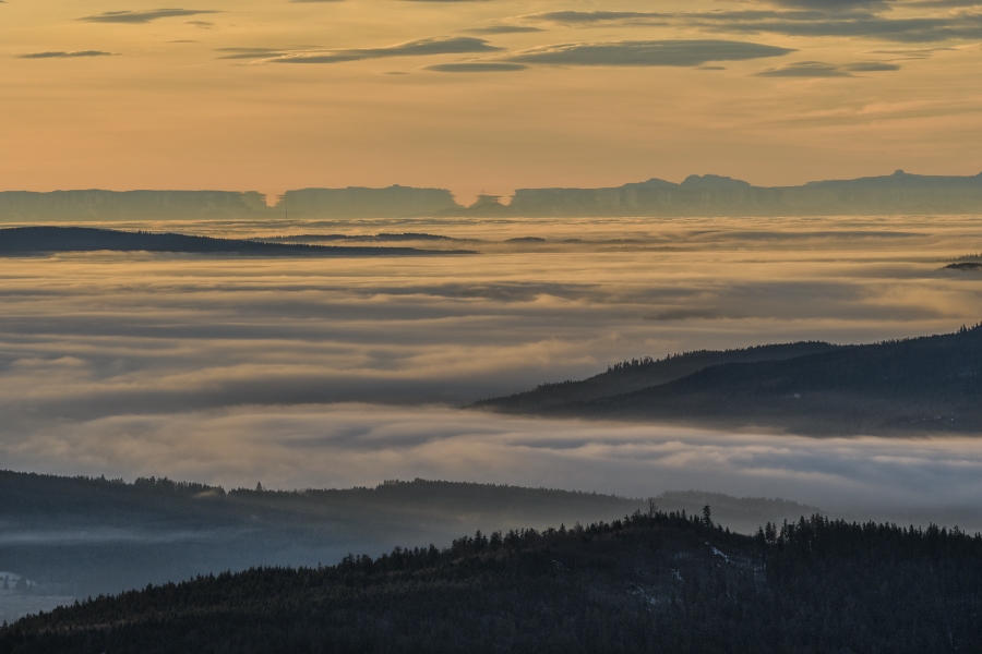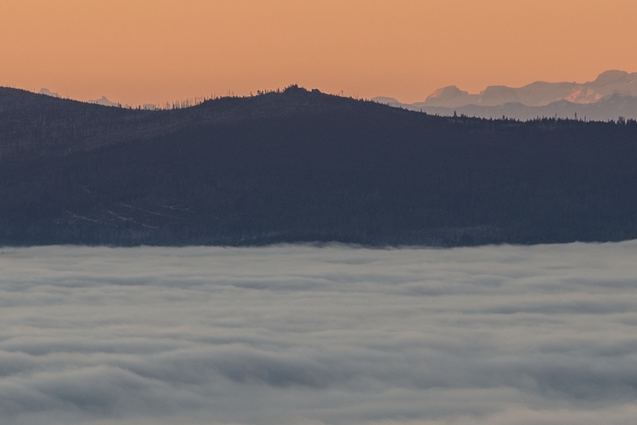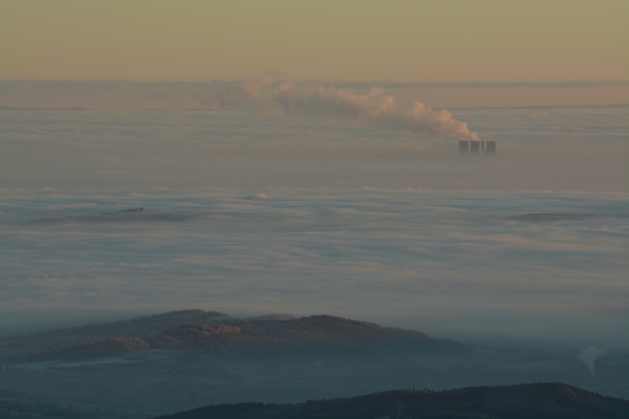 Zdvihající se protrhaná inverze pod takřka jednolitou svrchní šedou vrstvou poskytla dosud nevyšlému sluníčku skrze uzounký průzor …
