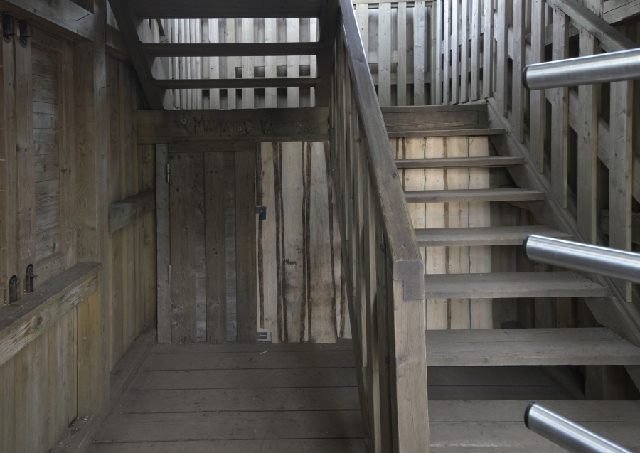 Ozvěna blížících se Vánoc dorazila zásluhou neznámé zdobící ruky i do přízemí boubínské rozhledny, kde, dvoubarevně zvýrazněna osvětlením vstupního turniketu, vyvolává na dřevěné, návštěvníky mnohokrát zhusta rozmanitě popsané a počmárané stěně iluzi příjemné útulnosti.
