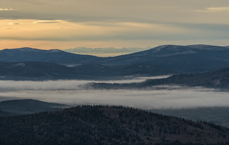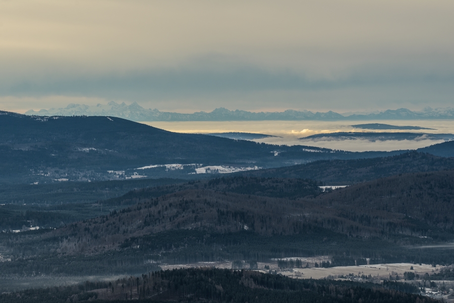 Navíc neustále naděluje – dnes například opět fantastická atmosférická zrcadlení nad Alpami, jen však v takové dálce, že z doslova davu nedělních návštěvníků rozhledny si jich s nemalou pravděpodobností povšiml jen málokdo. A podávaly se pravé lahůdky, z nichž jako první patrně věrné čtenáře fotokroniky napadne Zugspitze, jen za prosinec zde zachycená již počtvrté (předtím 4. , 15. a 19.). Pohlédněme však zcela vlevo nad Almberg, známý především proslulým lyžařským areálem Mitterdorf (v kteréžto souvislosti ponechme stranou otázku, k čemu se v čase přísných protipandemických opatření, zahrnujících mimo jiné policejní postihování případných turistů přistižených v přírodních lokalitách Bavorského lesa, na tamních sjezdovkách svítí). Jistě nám tam neunikne do mnohem větší optické výše dosahující nápadné zrcadlení nad hraničním pohořím Karwendel, náležícím k masivu Severních vápencových Alp a oddělujícím rakouské Tyrolsko od německého Bavorska. Průměrná vzdušná vzdálenost od Boubína zde činí 250 km a pro představu o nadmořských výškách si uveďme třeba nejvyšší vrchol Bikkarspitze – 2749 m n.m. či Hochkarspitze – 2483 m n.m. Jistě tak dojdeme k závěru, že se nejedná o nikterak méně úctyhodný jev …