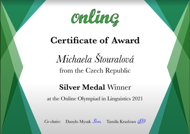 Letošního třetího ročníku Onlingu neboli Online Olympiad in Linguistic (Online lingvistické olympiády) se na konci ledna zúčastnila studentka 6. G Michaela Štouralová a mezi 1086 účastníky z 35 zemí celého světa se neztratila. Obsadila výborné 32. místo a získala ocenění stříbrným certifikátem. Míša si nejlépe poradila s thajštinou a tureckým ptačím jazykem.