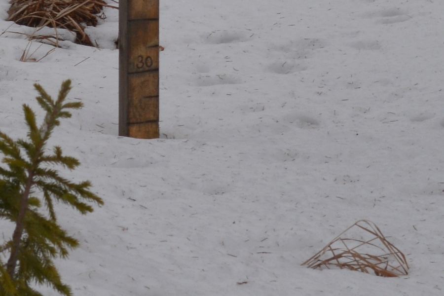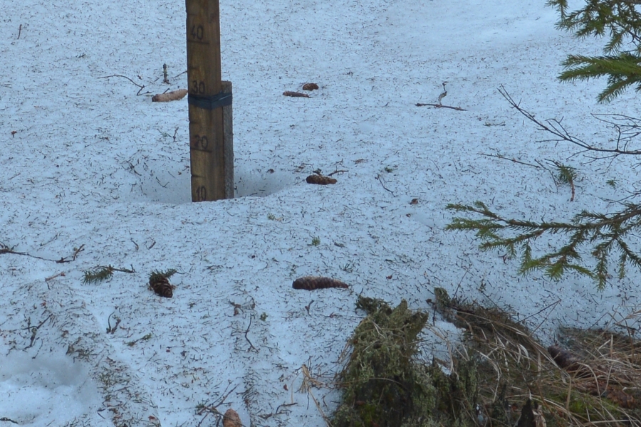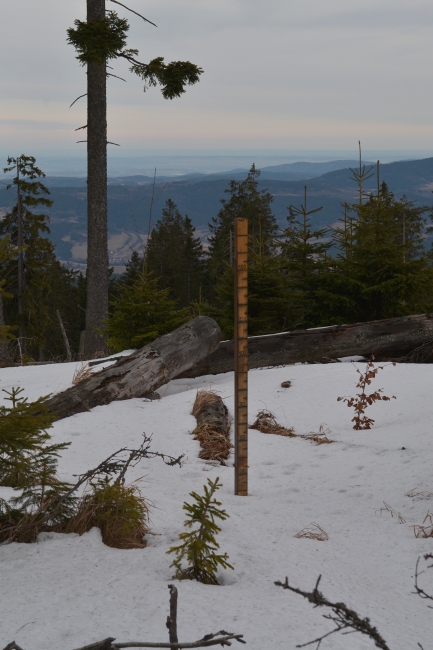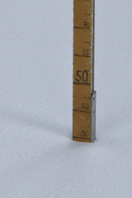 … resp. s detailem sněhoměrné tyče se snadno přesvědčíme o tom, jak dokáže jediná noc obohatit sněhovou nadílku, ještě nedávno (konkrétně 4. března) směřující bezmála k nule.