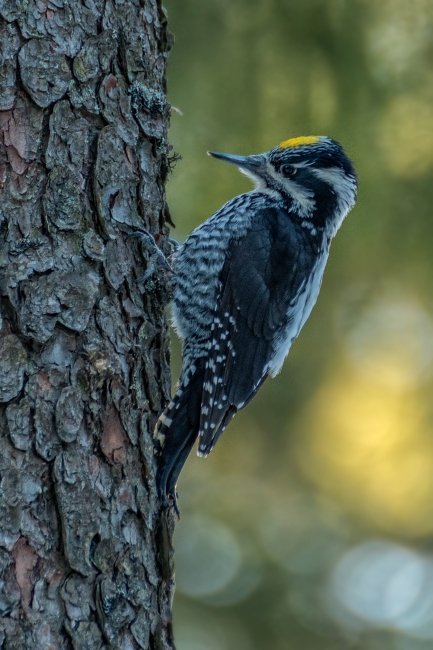 Stačilo zaposlouchat se do té přemíry švitořících hlásků, prokládaných jemným drnčením, a po chvilce už se dal hravě vystopovat jeden z mnoha párů datlíka tříprstého (Picoides tridactylus) .