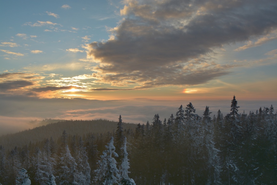 Boubín, dnešního večera přizdobený úchvatně zřetelnými parhelii a halovým slunečním sloupem, opět v krátké době ve svých smrčinách zezelenal.