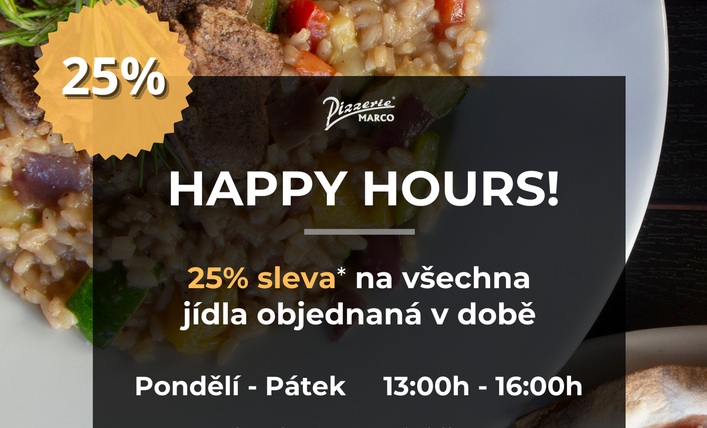 Od pondělí do pátku jsme připravili akci happy hours, na objednávky od 13 do 16 hodin sleva na jídlo 25%.
