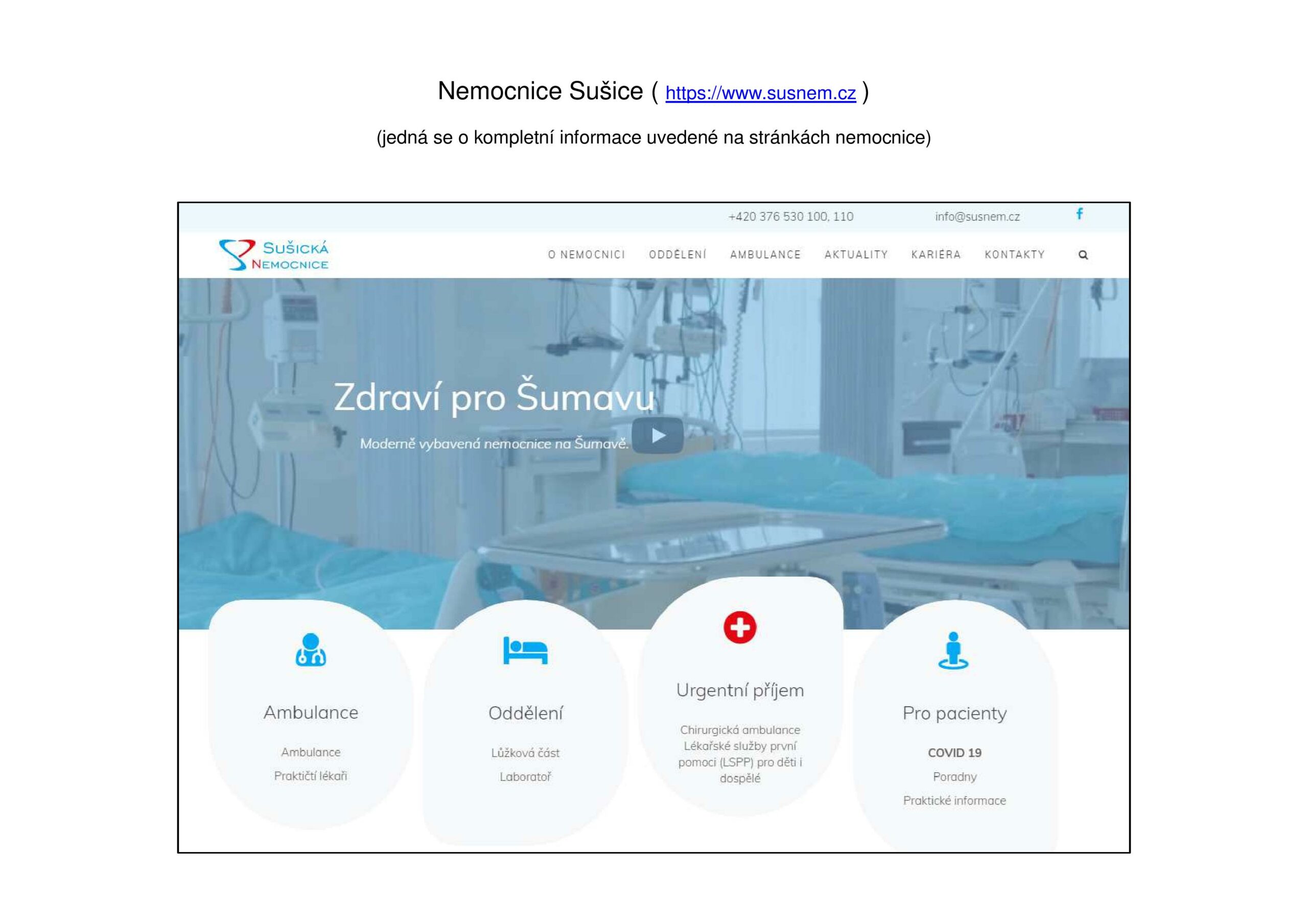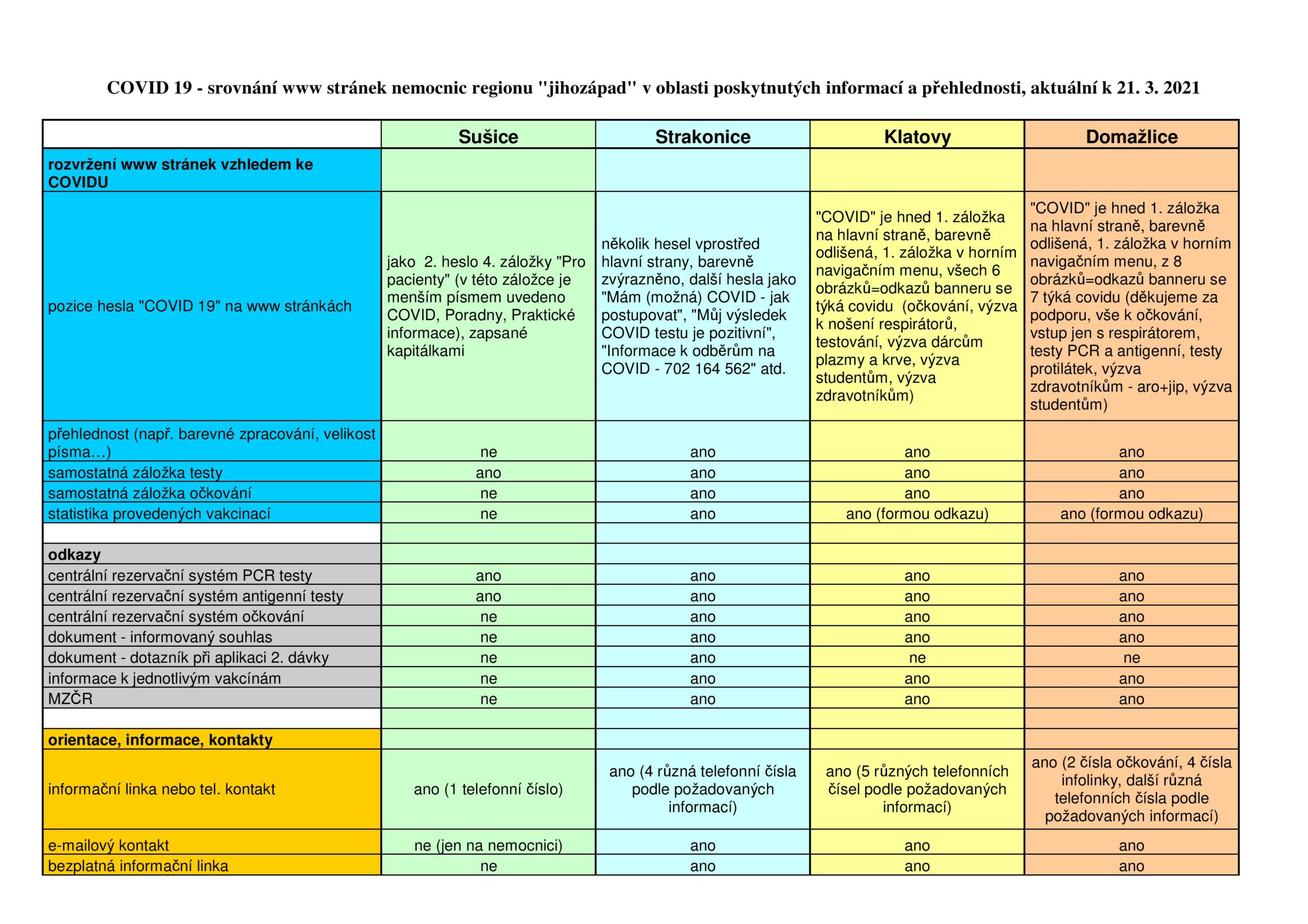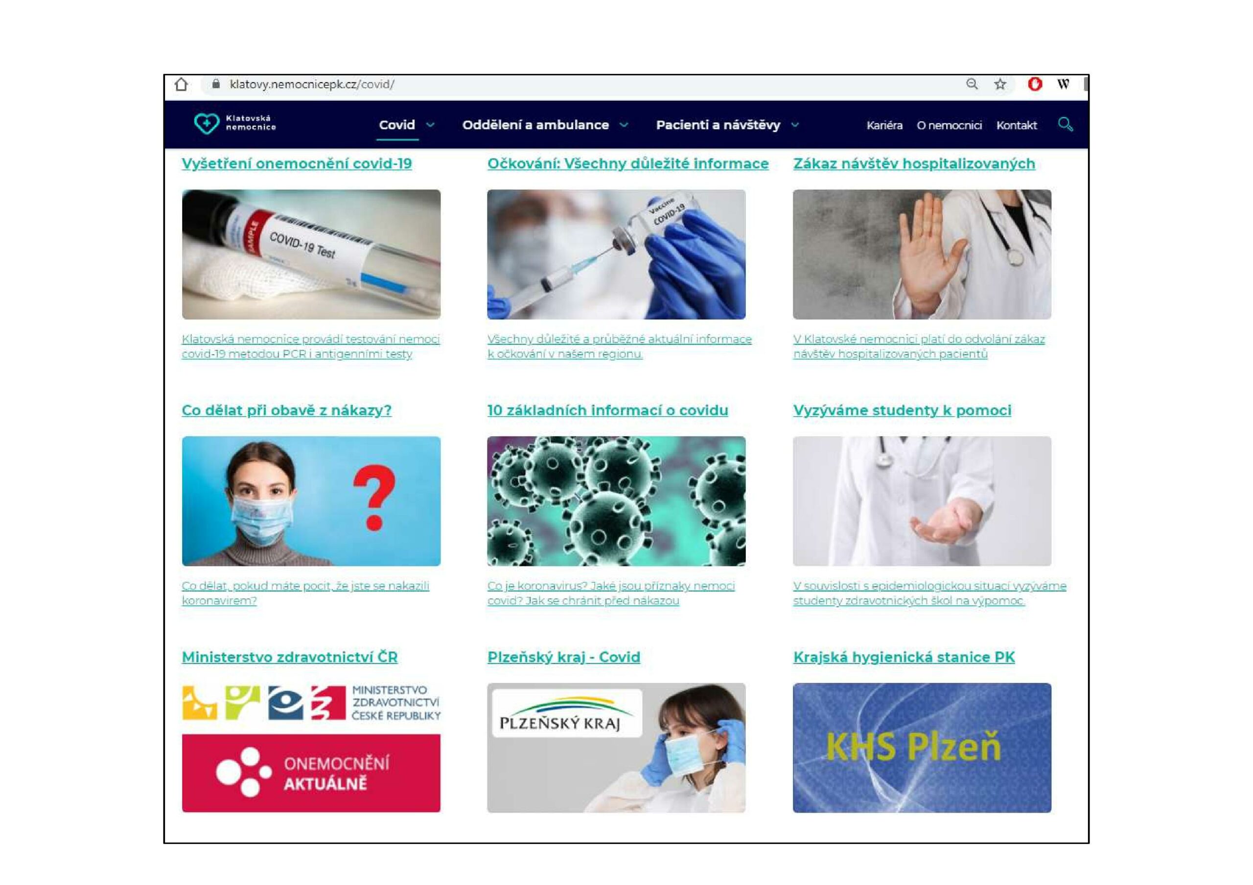 Přehled a srovnání informací (o Covidu-19) poskytovaných na webových stránkách regionálních nemocnic v Sušici, Klatovech, Strakonicích a Domažlicích.